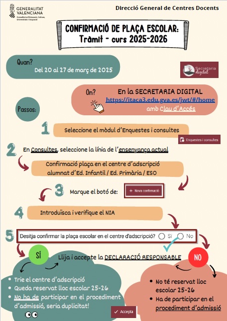 - Confirmad plaza del 20 a 27 de Marzo* si pertenecéis a un centro adscrito para asegurar la plaza en el IES Serra d’Espada para el curso 2025-2026.