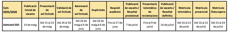 CALENDARIO ADMISIÓN ALUMNADO ESO FASE ORDINARIA 2025-2026