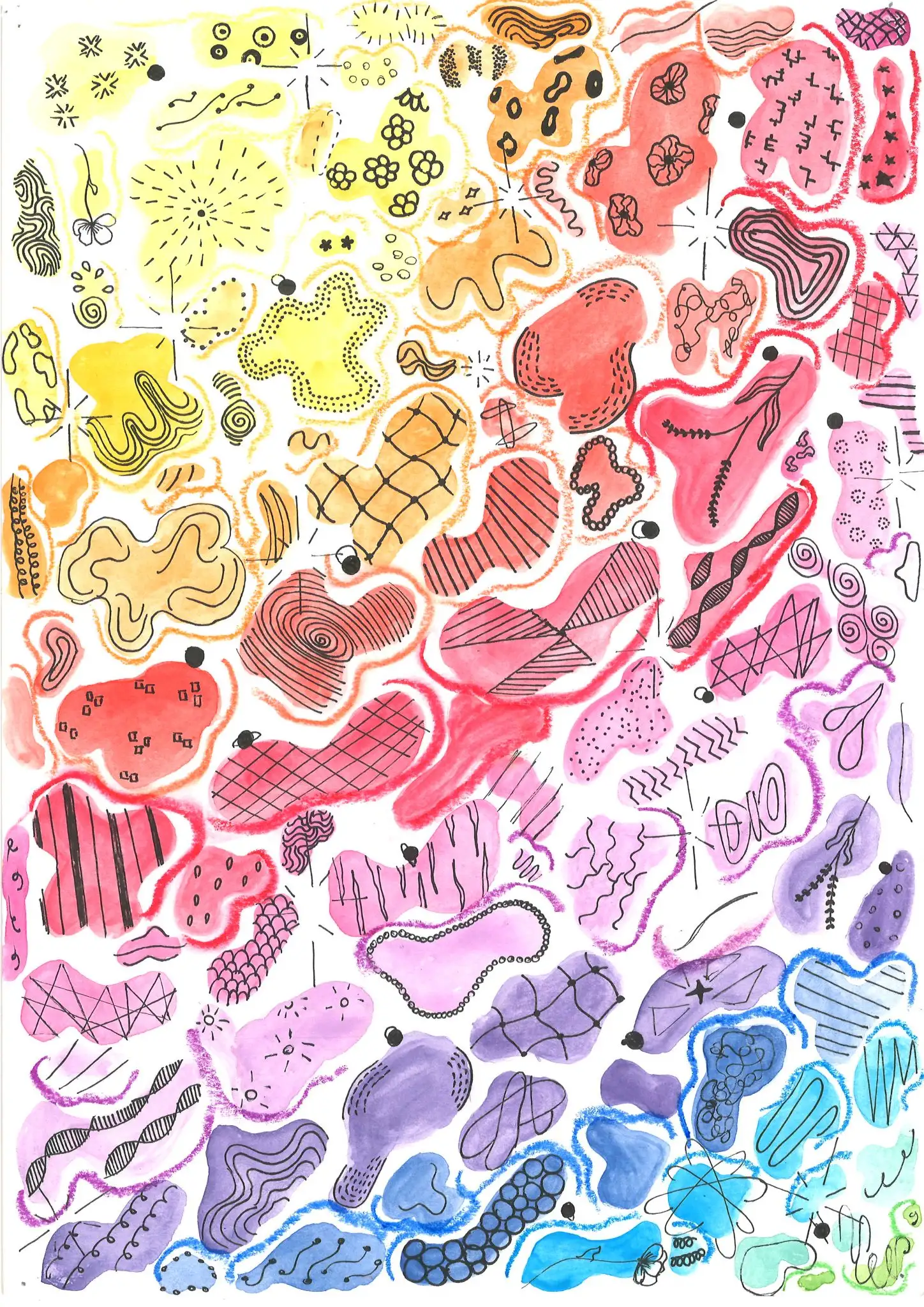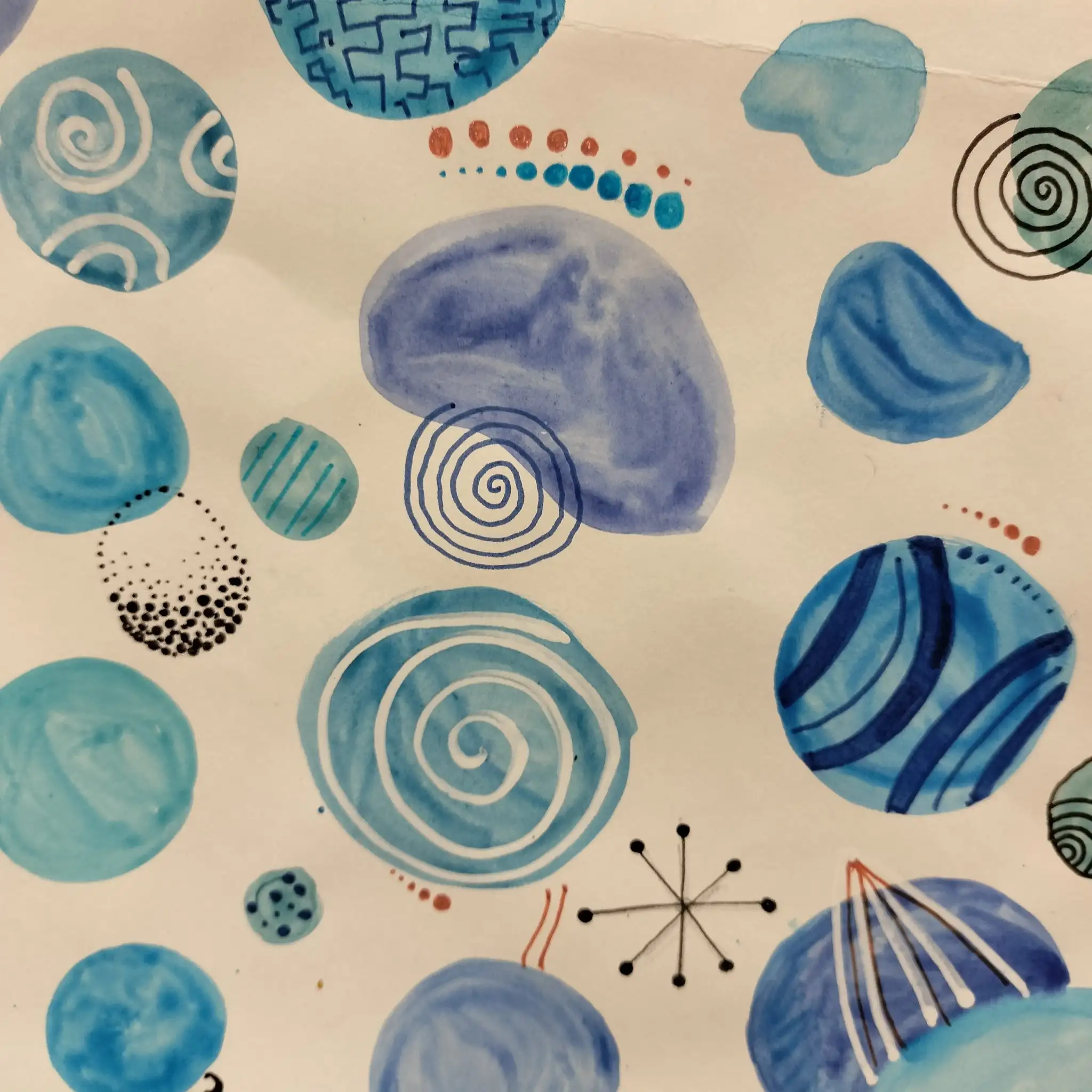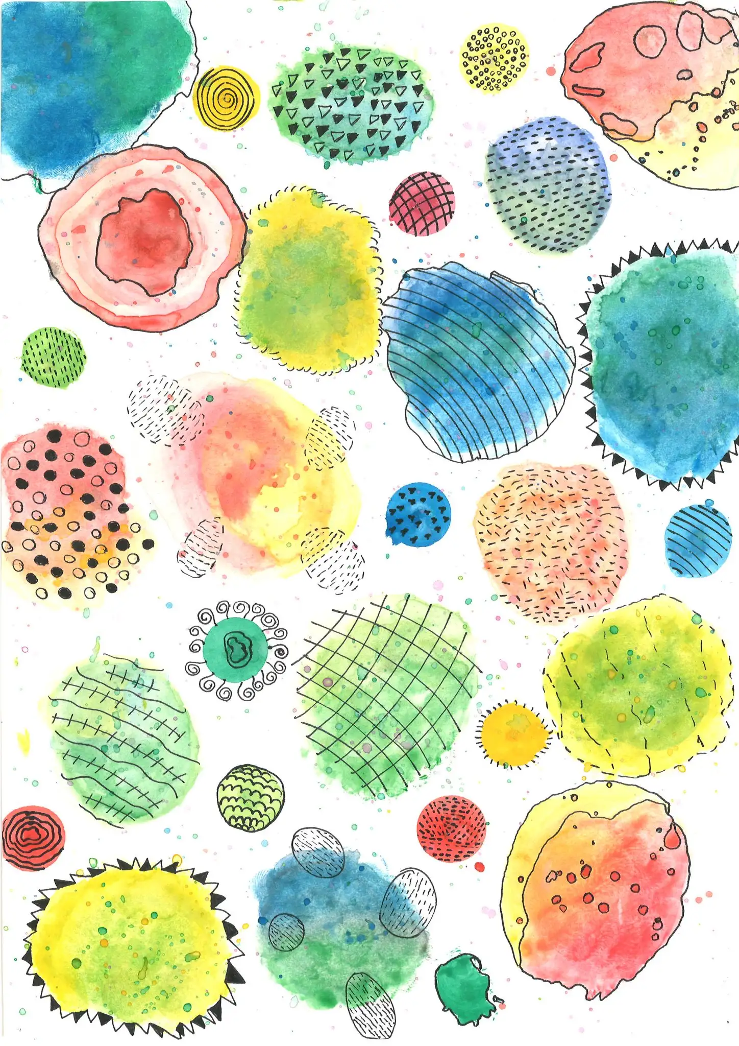 En aquest projecte, l’alumnat ha experimentat amb la tècnica de l’aquarel·la, utilitzant-la per crear taques i plans de color que serveixen de base expressiva per a les seves composicions. A partir d’aquests fons, han intervingut amb retolador, explorant la riquesa del punt i la línia com a recursos gràfics per estructurar i donar dinamisme a les seves obres.
