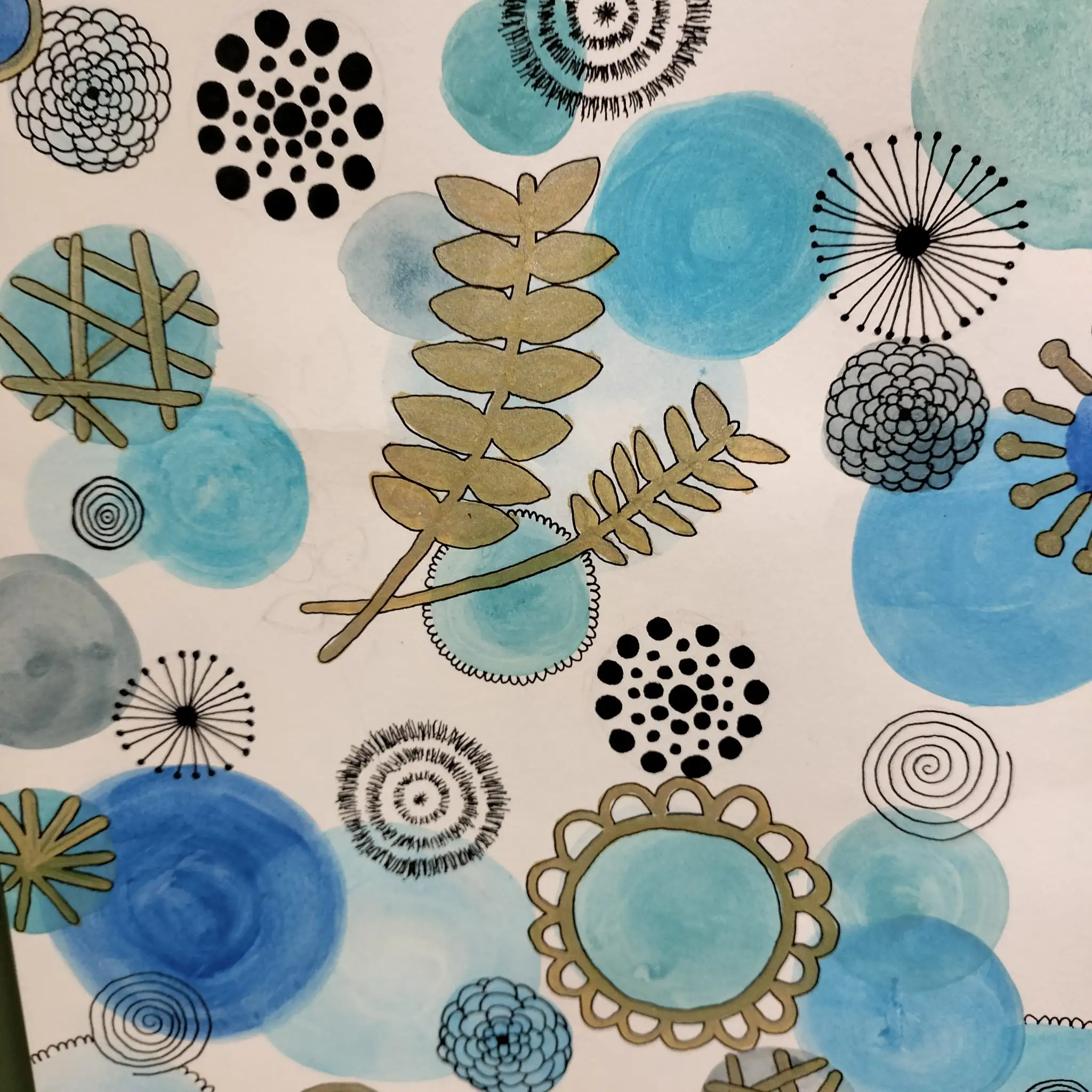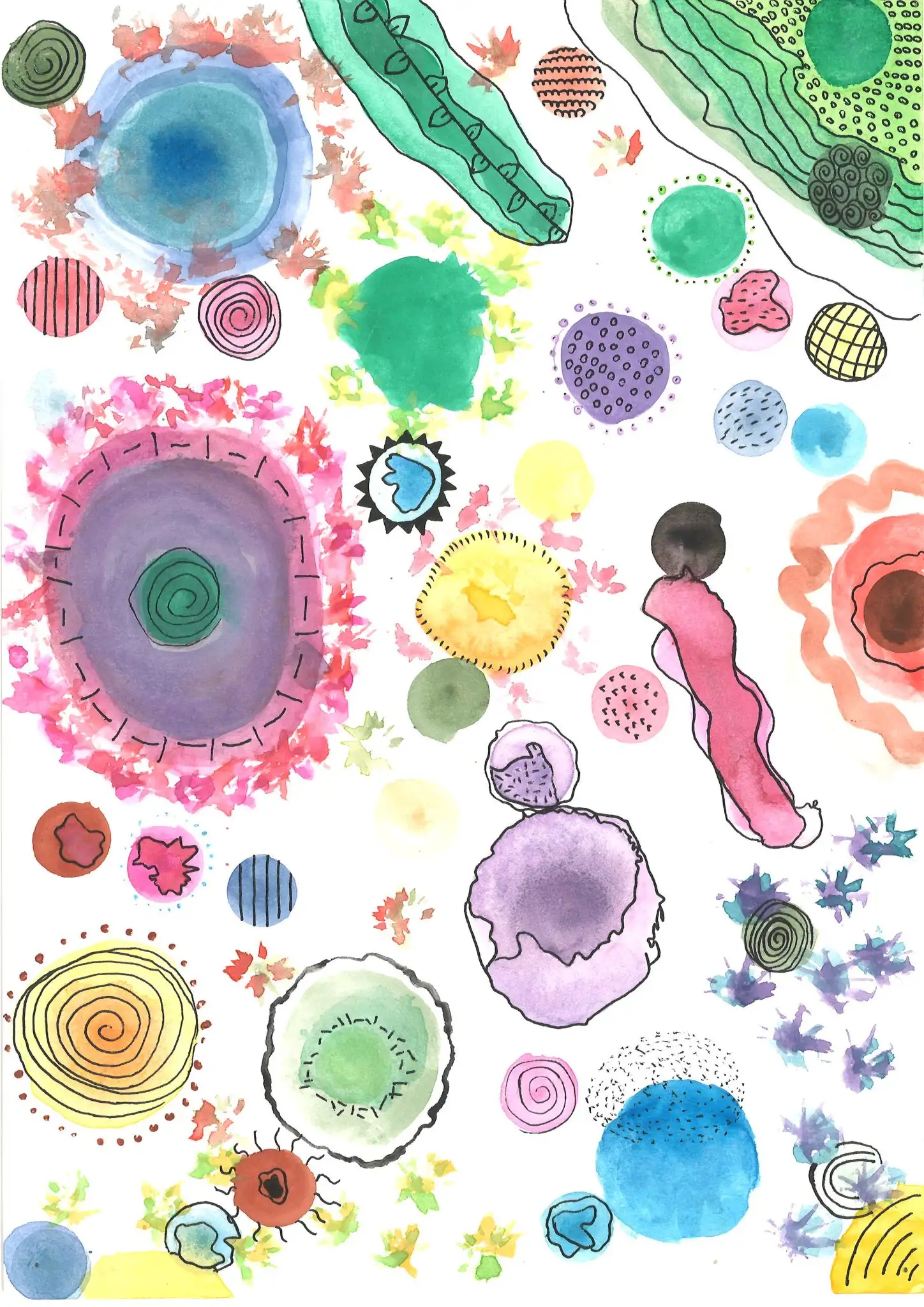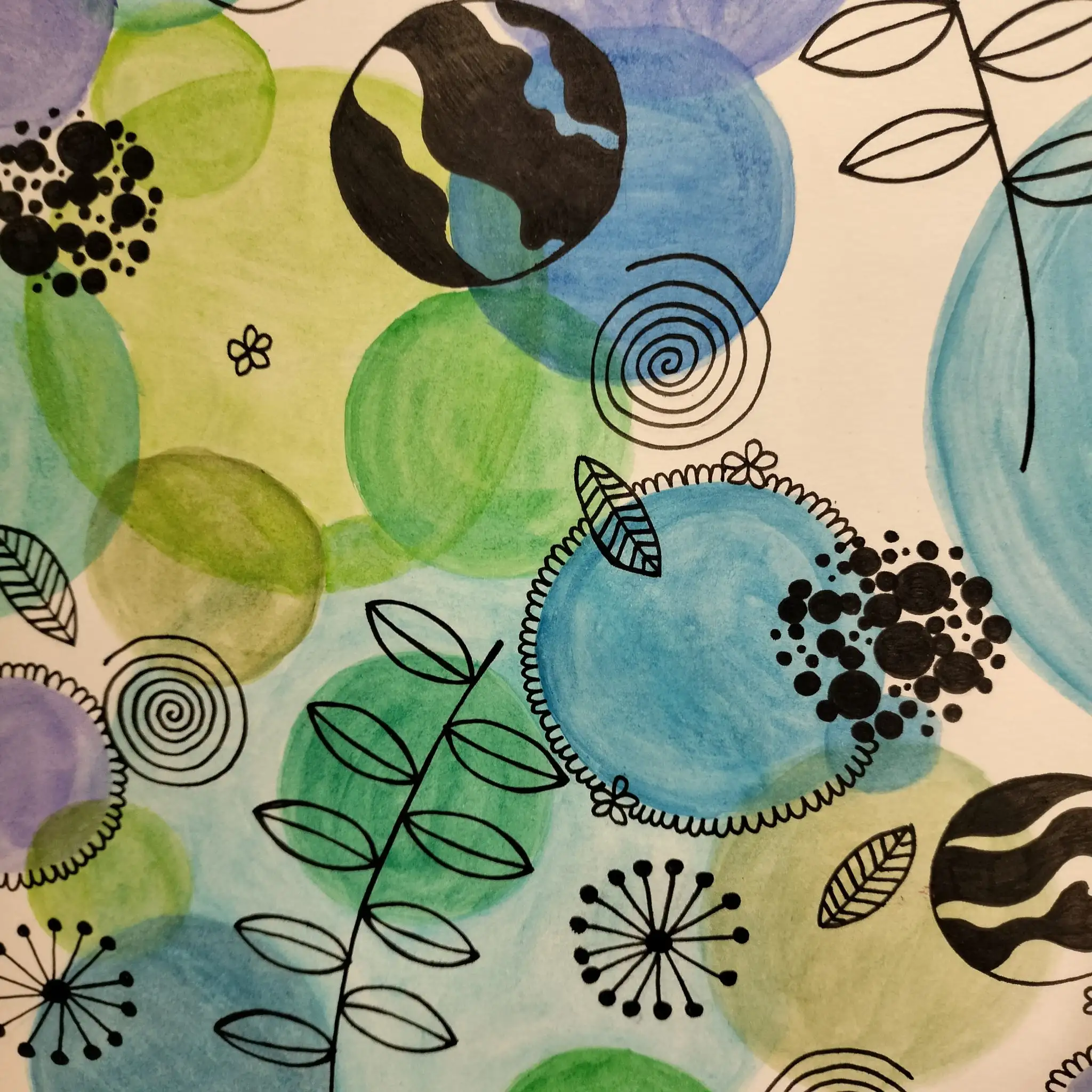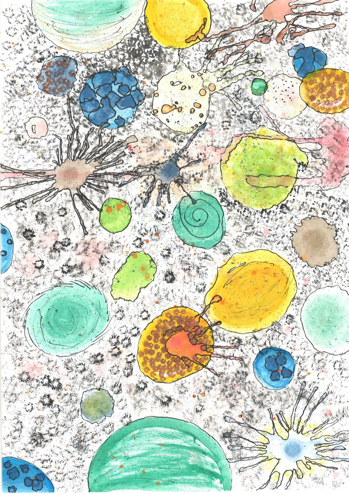 En aquest projecte, l’alumnat ha experimentat amb la tècnica de l’aquarel·la, utilitzant-la per crear taques i plans de color que serveixen de base expressiva per a les seves composicions. A partir d’aquests fons, han intervingut amb retolador, explorant la riquesa del punt i la línia com a recursos gràfics per estructurar i donar dinamisme a les seves obres.