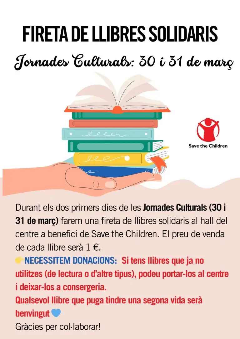 Estimades famílies,Us animem a participar en la Fira de Llibres Solidaris, que tindrà lloc durant les Jornades Culturals, aportant llibres en bon estat de manera voluntària. Els llibres es vendran a 1 € i tots els diners recaptats es destinaran a Save the Children. A més, si ho desitgeu, podeu col·laborar donant una xicoteta quantitat … Llegir més