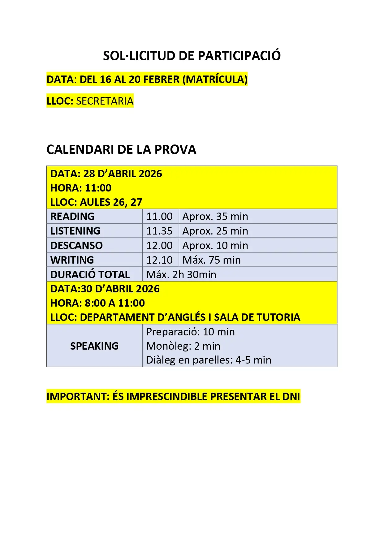 PRESENTACIÓ DE SOL·LICITUD: DEL 16 FINS AL 20 DE FEBRER DE 2026, ELS DOS INCLOSOS A LA SECRETARIA DEL CENTRE.