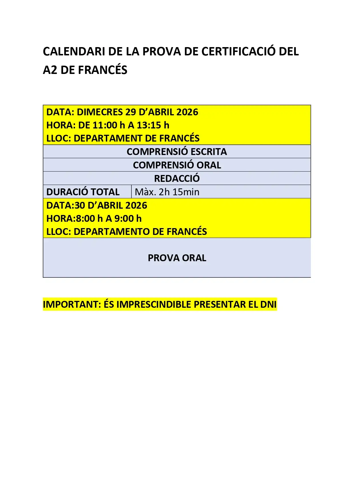 PROVES DE CERTIFICACIÓ A2 D’ANGLÉS I FRANCÉS.