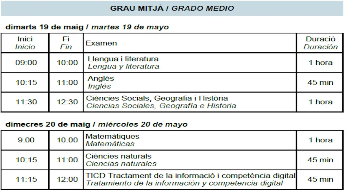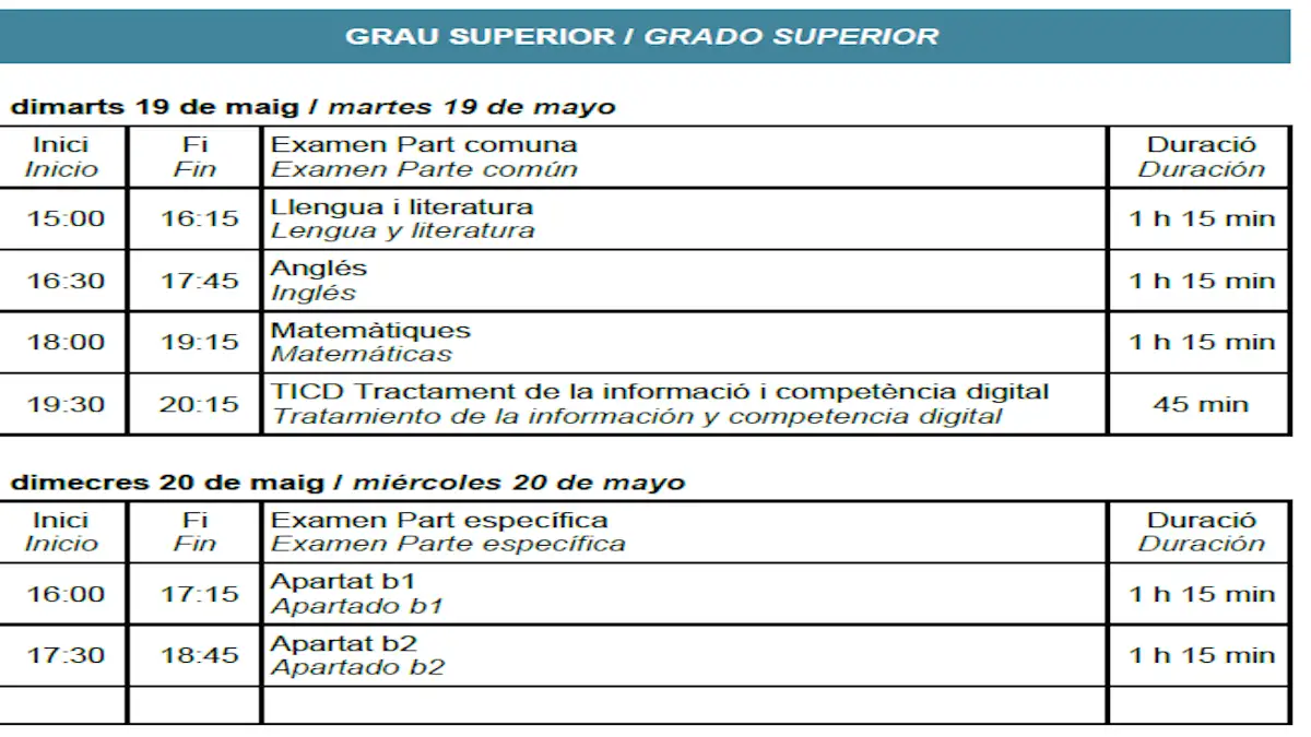 Dates dels exàmens: 19 i 20 de maig de 2026
