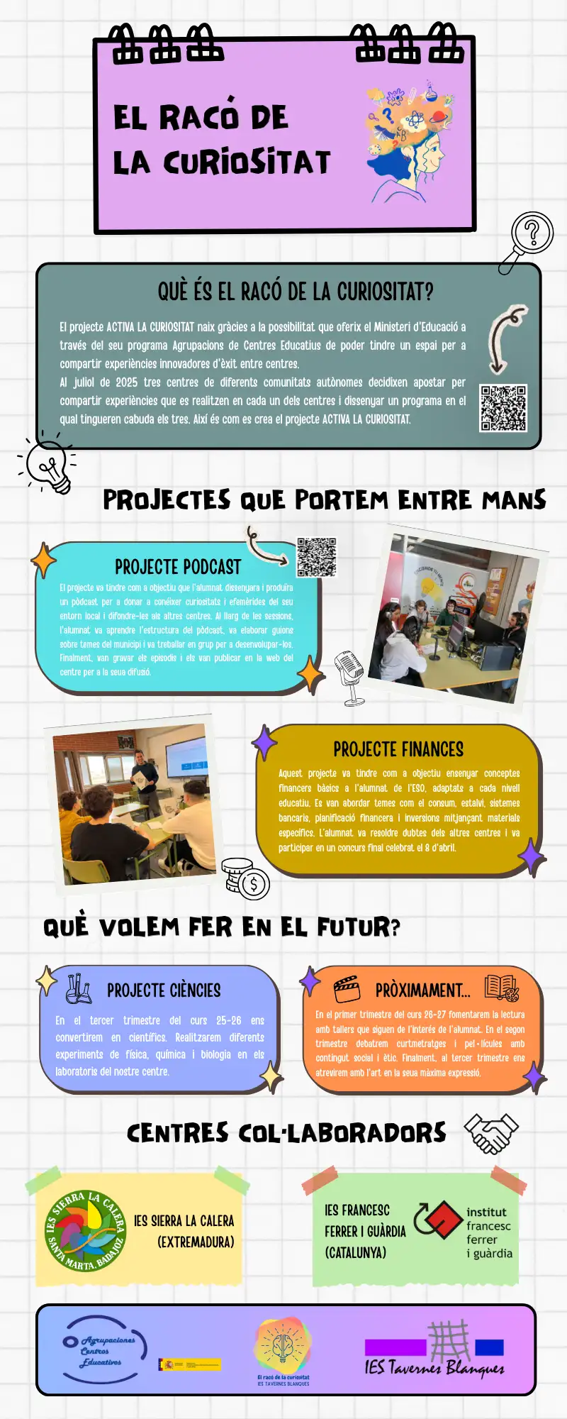 El racó de la curiositat segueix a ple rendiment i abans de començar amb el tercer projecte relacionat amb les Ciències, hem volgut crear un mural en el qual resumim totes les experiències que hem viscut i aquelles que estan per gaudir. En breu estarà exposat en el hall (Racó de la curiositat).