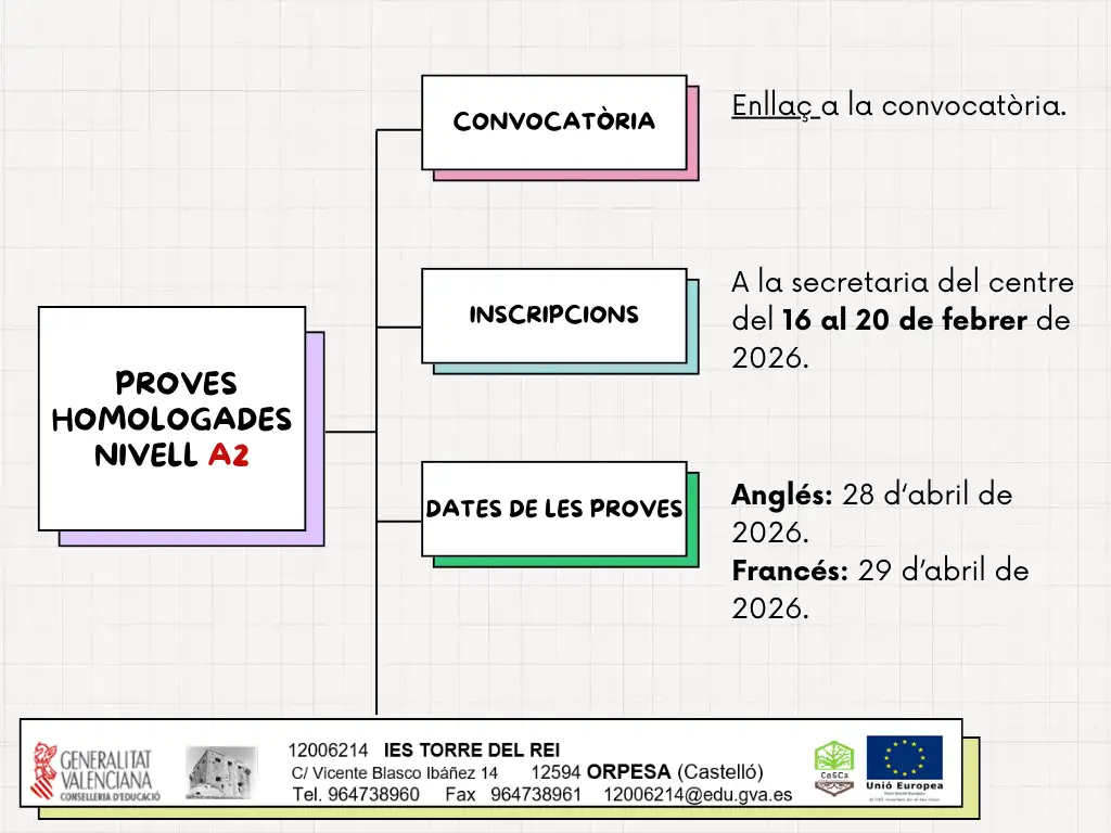 Els pròxims 28 i 29 d’abril tindran lloc al nostre centre els exàmens oficials per a poder obtenir els certificats de competència A2 en francés 🇫🇷 o anglés 🇬🇧.