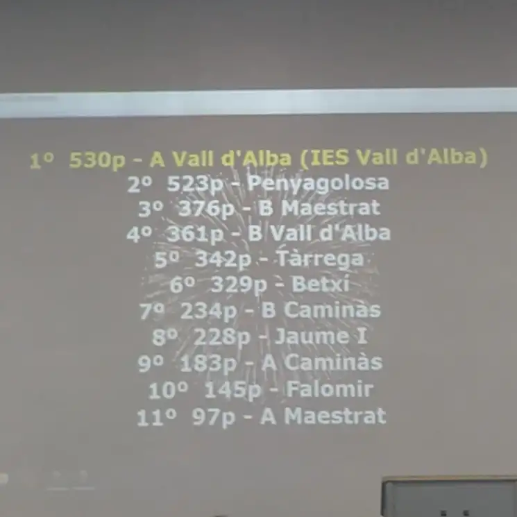 En la categoria júnior, un dels dos equips que representaven l’IES la Vall d’Alba va aconseguir la primera posició, compartint el triomf amb l’IES Benigasló de la Vall d’Uixó. Un magnífic resultat que reflecteix l’esforç, el talent i la capacitat de treball col·laboratiu del nostre alumnat.