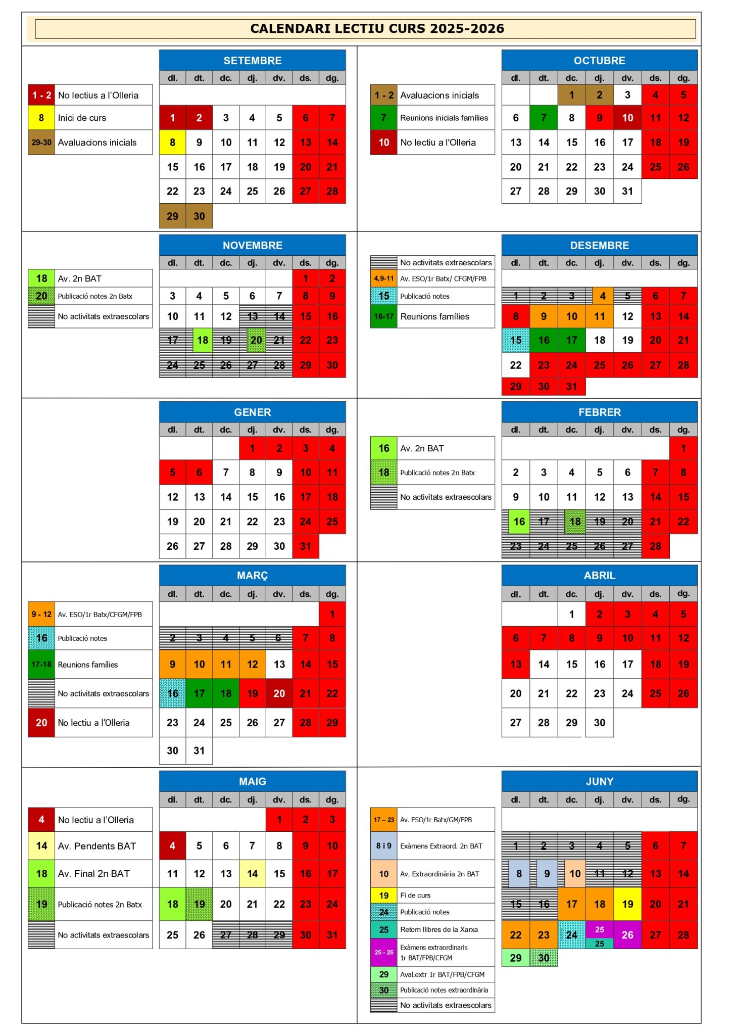 Aquest és el calendari escolar provisional per al curs 2025-2026, que podeu descarregar en pdf en l’enllaç següent: Calendari 2025-2026