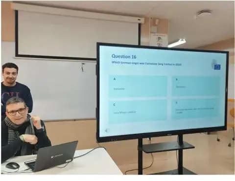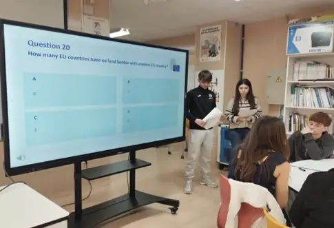 Los embajadores junior junto con compañeros de clase de 4º de la ESO han elaborado un juego interactivo a base de preguntas sobre la Unión Europea. Para su elaboración han utilizado diferentes materiales publicados por el Parlamento Europeo, así como información de textos en general. Este juego ha resultado muy práctico para poder pasarlo a diferentes alumnos y dar a conocer conocimientos de la UE.