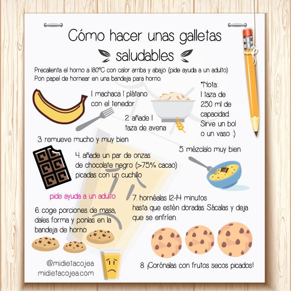 A raíz del post ¿Qué le pongo en el almuerzo? en el que el día de los dulces, galletas y bollería aparecía «galletas caseras de plátano y avena», muchos alumnos pidieron que les enseñáramos a hacer esas galletas.