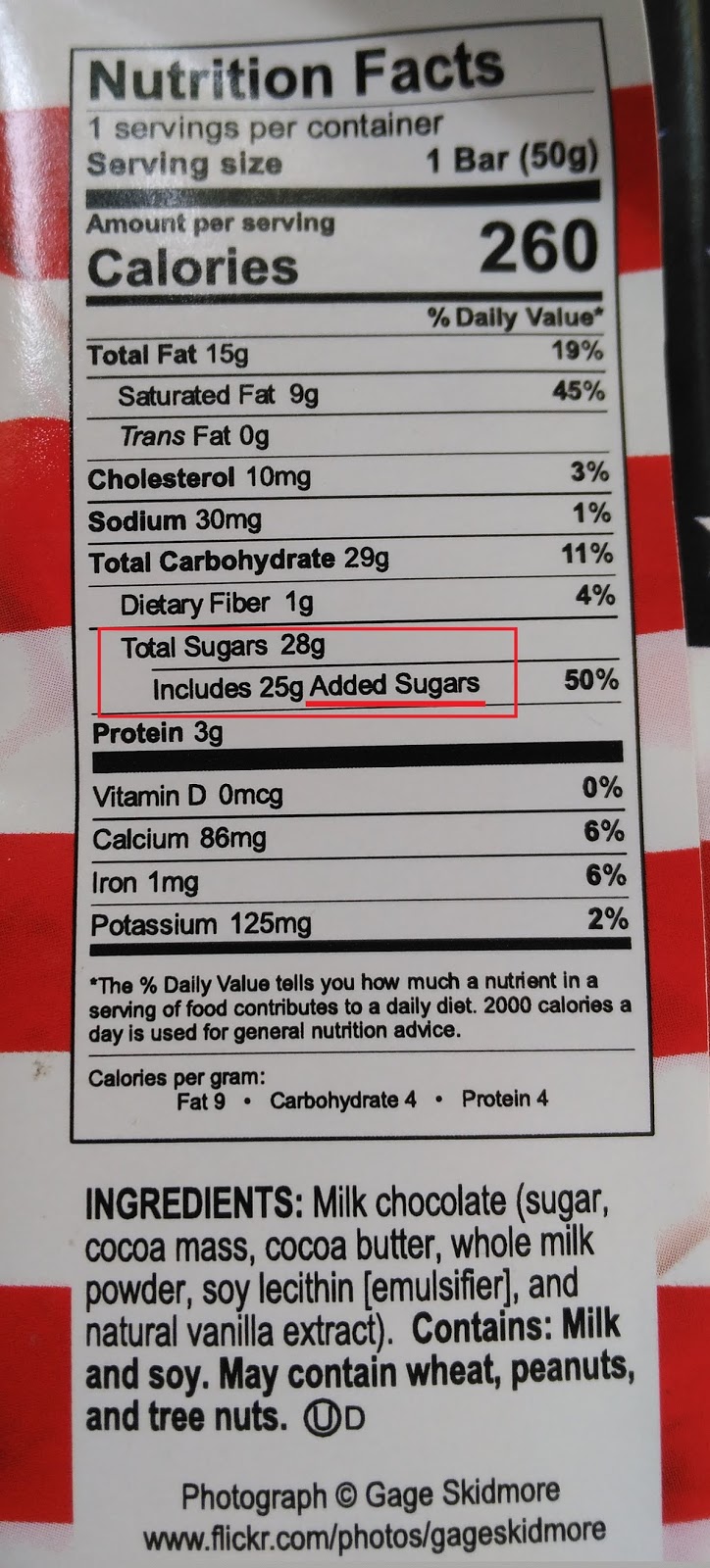 Además de fijarnos en los ingredientes, podemos ver la tabla nutricional en la que menciona los hidratos de carbono y especifica de los cuales cuántos son azúcar. Pero en España no tienen la obligación de mencionar qué cantidad de azúcar es añadido y qué cantidad es el propio del alimento. En otros países, como podemos ver en la imagen, sí lo identifican.