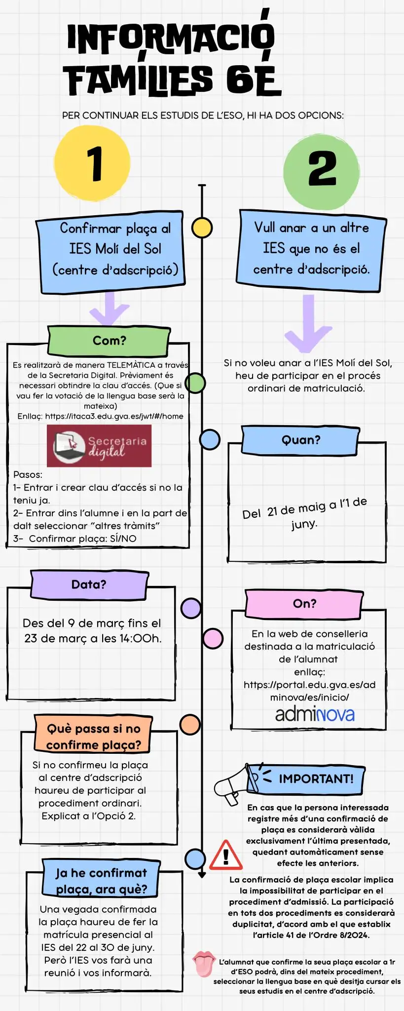 Si no voleu que la vostra filla o fill curse el primer de l’Educació Secundària a l’IES Molí del Sol entreu a la Secretaria Digital i marqueu l’opció de NO CONFIRME plaça en el centre d’adscripció i perdreu la reserva de la plaça per al curs 2026-2027 per la vostra filla o fill.