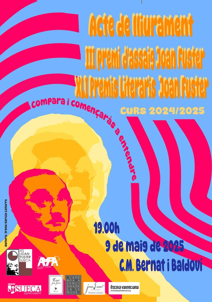 El pròxim divendres, dia 9 de maig de 2025, a les 19.00h, al C.M. Bernat i Baldoví, tindrà lloc l’Acte de lliurament dels Premis Literaris Joan Fuster 2025.