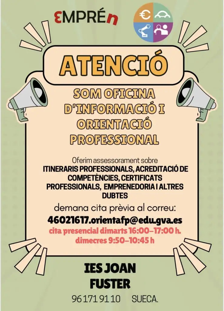 📣 Necessites orientació per al teu futur professional? A l’IES Joan Fuster tens a la teua disposició l’Oficina d’Informació i Orientació Professional d’Emprén.