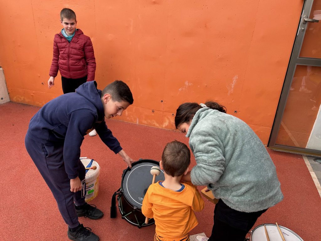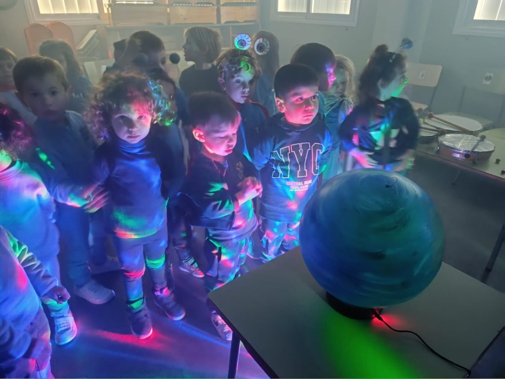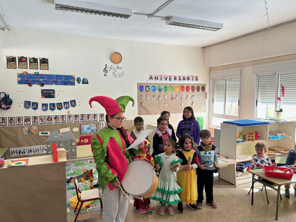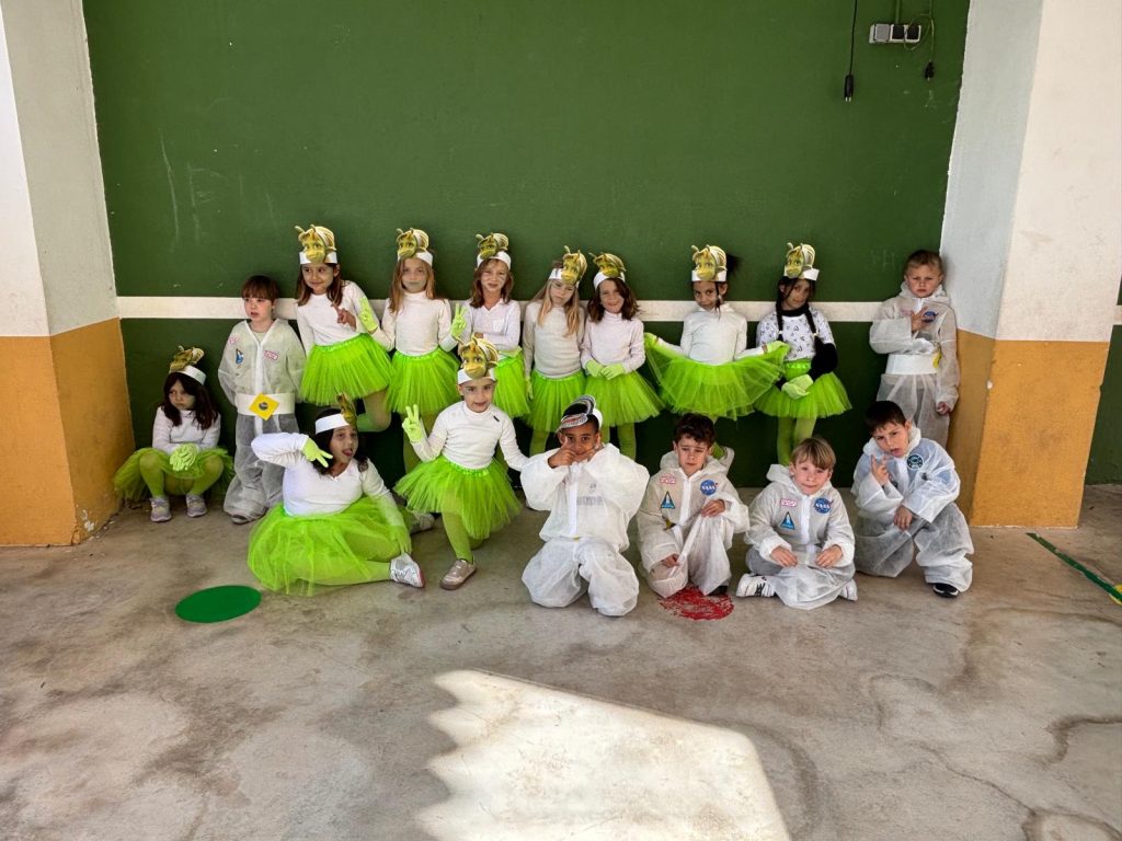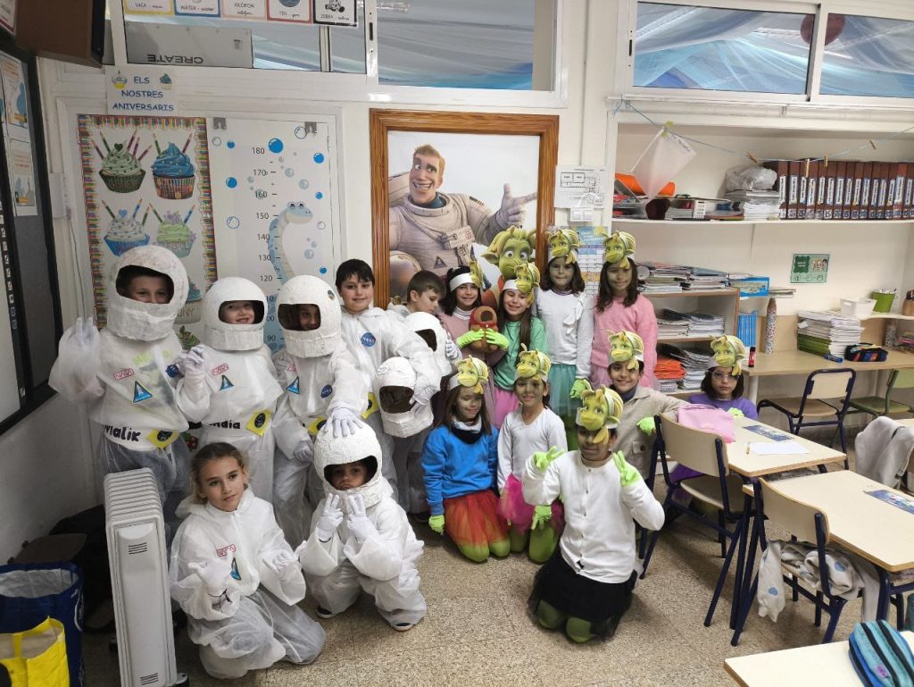 La jornada va començar amb la tradicional visita de l’alumnat de cinquè i sisè a l’escoleta, on amb una vibrant batucada van sorprendre i animar els més menuts. A més, els xiquets i xiquetes de l’escoleta i les seues educadores ens van preparar una sorpresa molt especial: un xicotet aperitiu en una sala ambientada amb llum ultraviolada que simulava un espai sideral.
