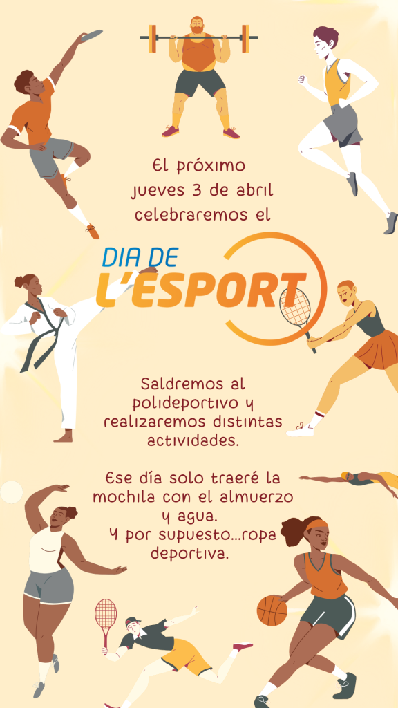 El Dia de l’Esport es una iniciativa dirigida a los centros educativos de primaria y secundaria que busca promover la actividad física entre su alumnado. Por ello, invita a la celebración de una jornada deportiva organizada por los centros conmemorando el Día Internacional de la Actividad Física. Nuestro centro quiere participar como cada año y este curso especialmente ya que la temática es «Contra el bullying».