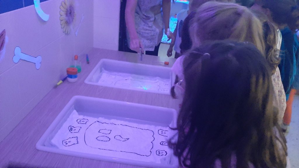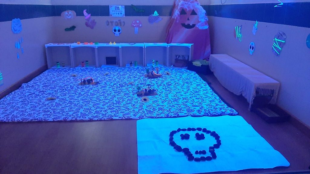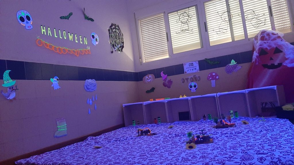 En el aula sensorial, la luz negra y los materiales temáticos convirtieron el espacio en un entorno mágico donde los niños y niñas pudieron explorar, experimentar y dejar volar su imaginación. Además, la música también estuvo presente con una divertida sesión de percusión con vasos por los más mayores del centro, y no faltaron los momentos de calma y fantasía con la lectura de cuentos.