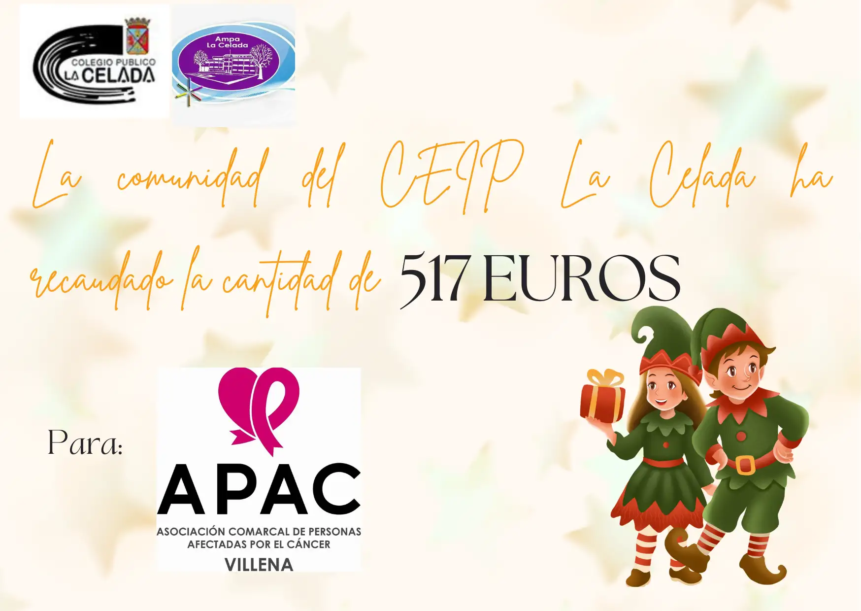 Uno de los momentos más destacados ha sido la realización de un mercadillo solidario, en el que se han vendido manualidades elaboradas por los propios niños y niñas. Todo lo recaudado ha sido donado a la asociación APAC, dedicada a la ayuda y apoyo a personas afectadas por el cáncer, convirtiendo esta actividad en una valiosa experiencia de concienciación y compromiso social.