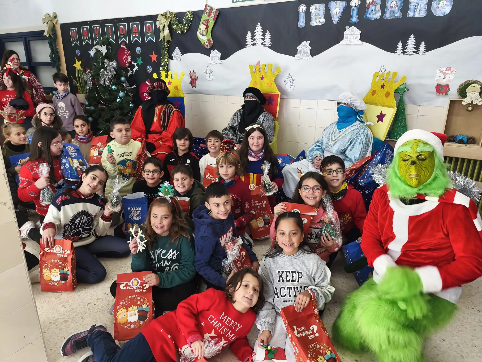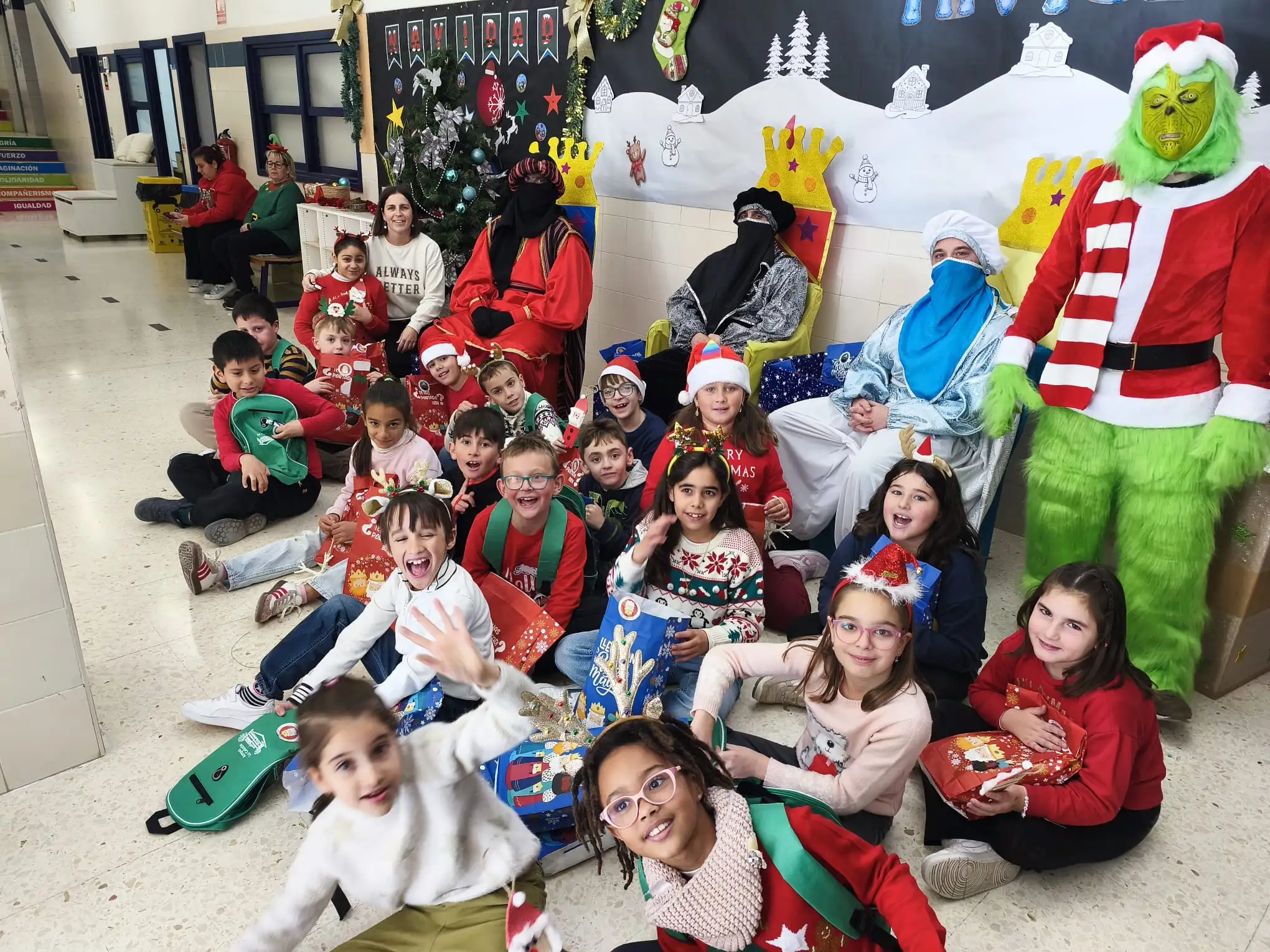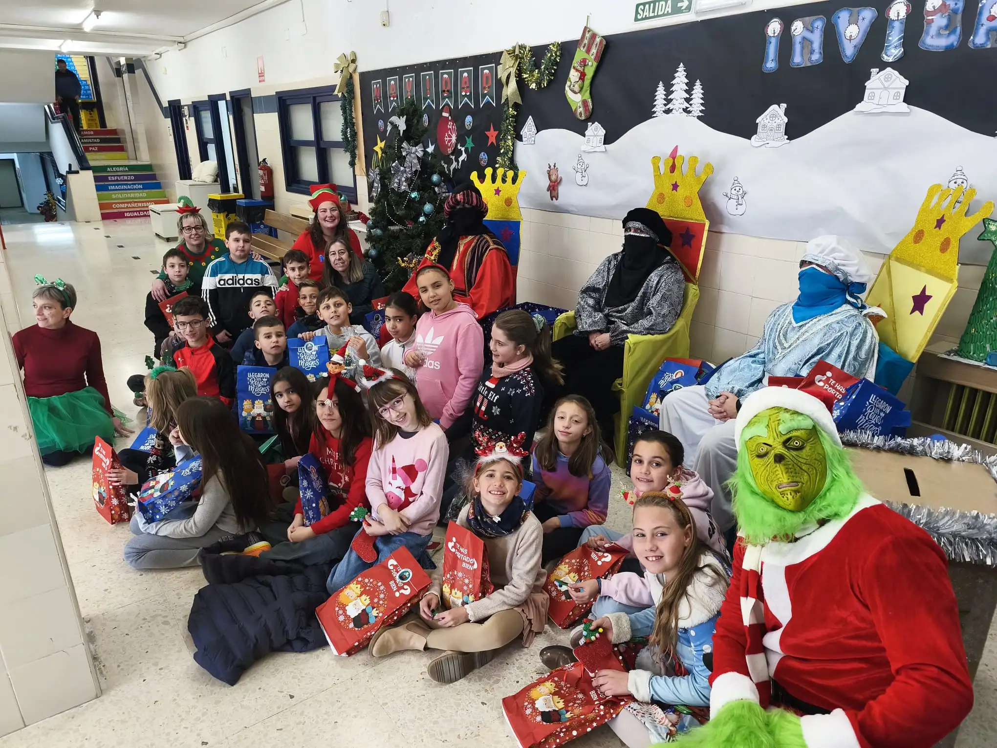 La jornada ha continuado con la recepción de los Pajes Reales, a quienes el alumnado ha podido entregar sus cartas llenas de deseos e ilusión. Además, la visita sorpresa del Grinch ha provocado risas y momentos muy divertidos entre todos los asistentes.