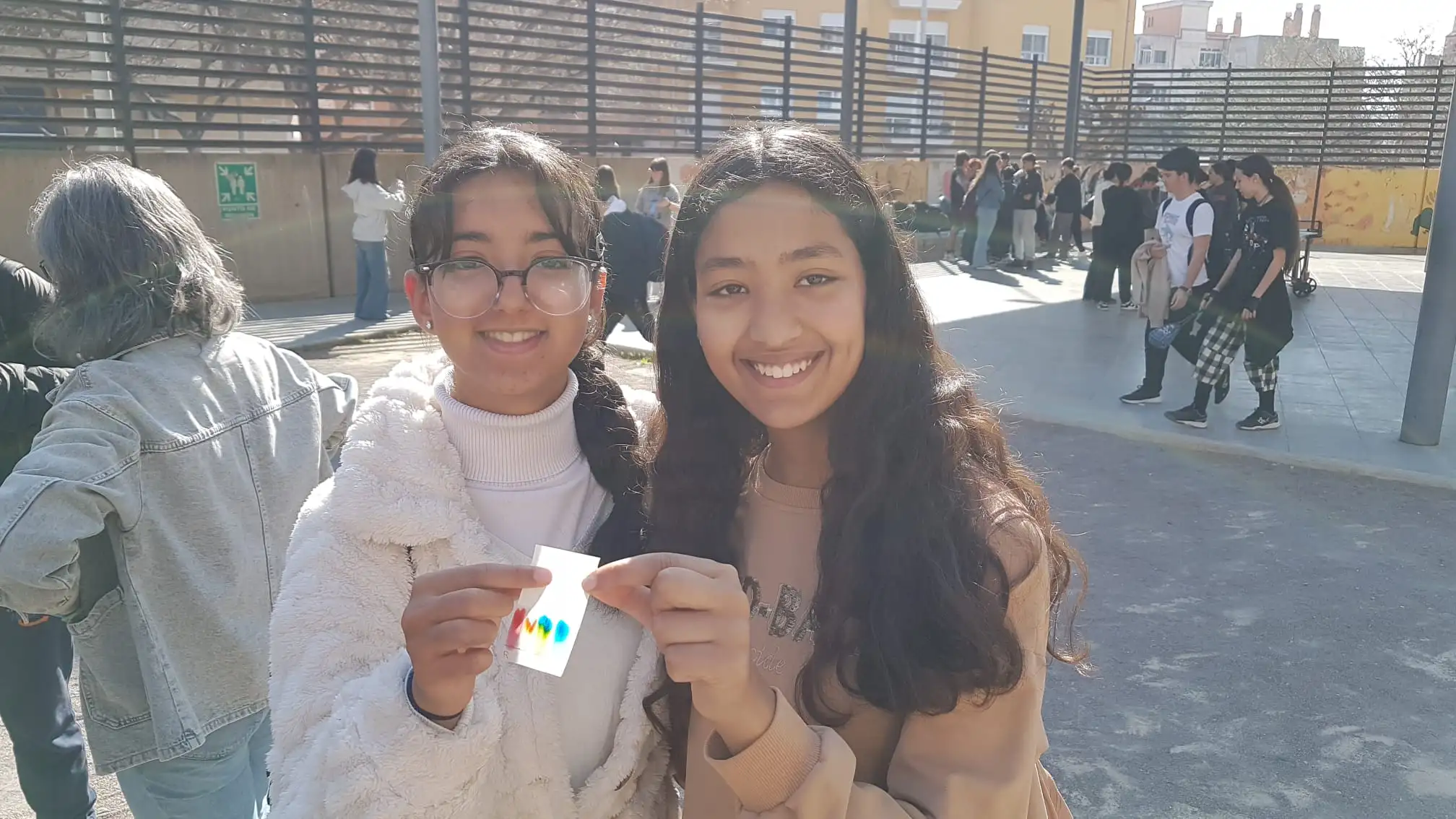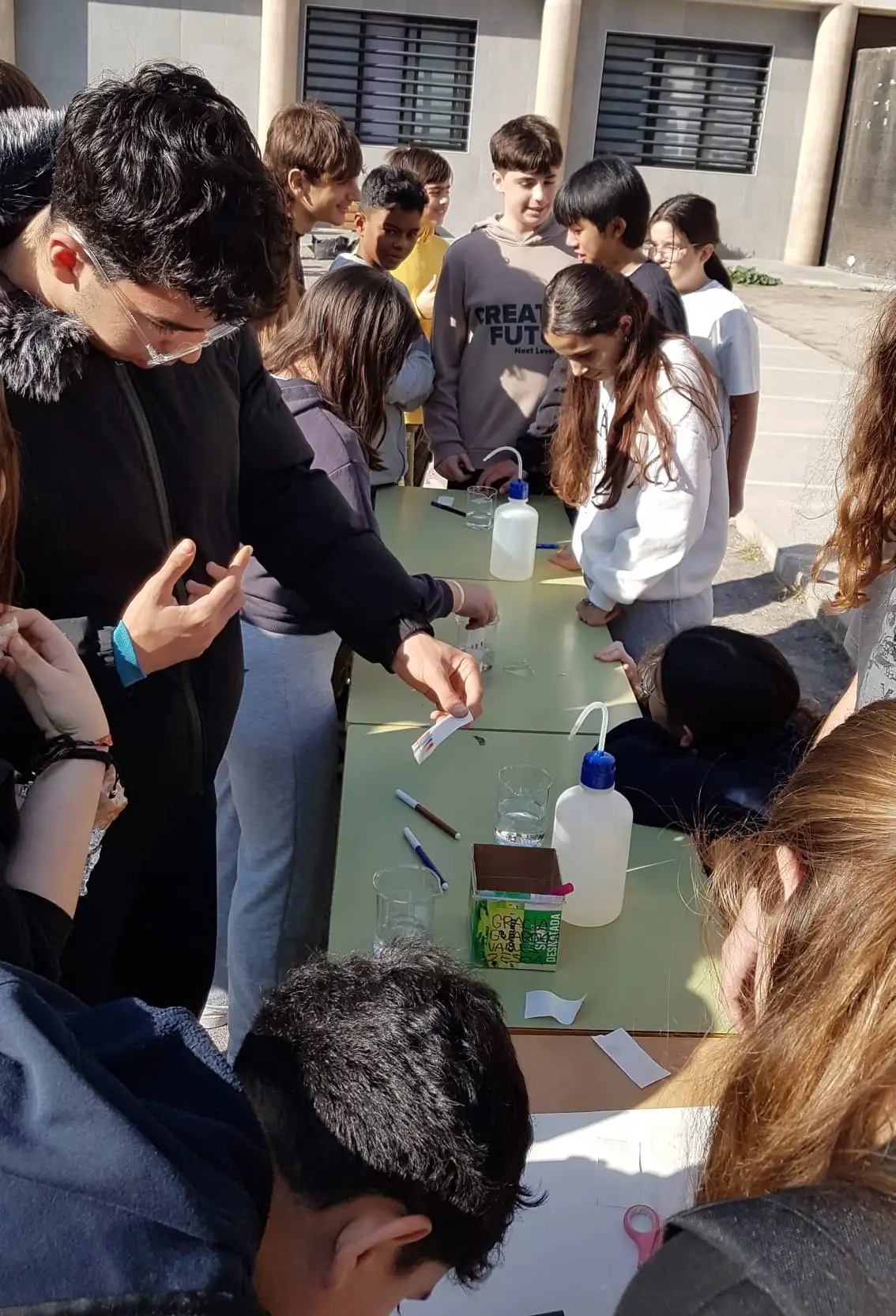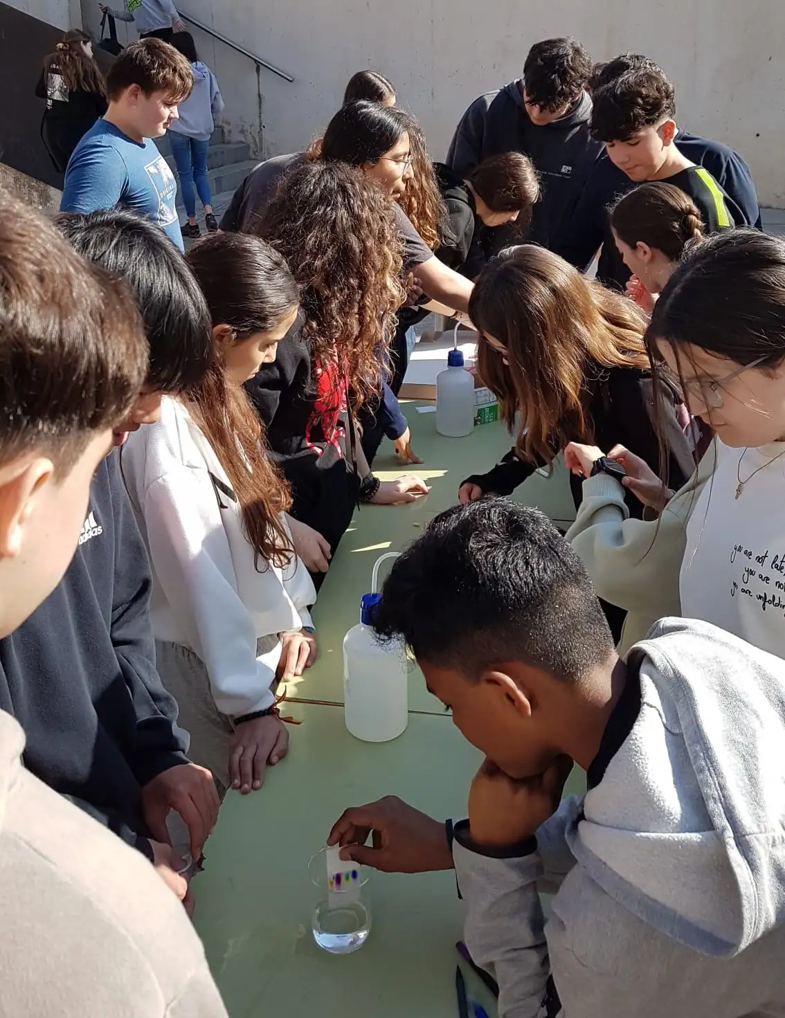 L’alumnat de l’optativa de 2n d’ESO Taller d’aprofundiment de Física i Química han organitzat un pati lúdic on els alumnes que volien podien realitzar una cromatografia per separar els components de tintes.