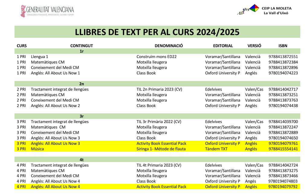 Matins: de 9h a 12:45h. (Menjador de 12:45h a 15h) Vesprades: de 15h a 16:30h.
