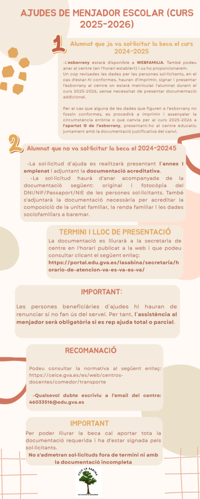 L’alumnat que vulga sol·licitar beca de menjador haurà de presentar la sol·licitud de l’annex de la resolució amb les dades les dos progenitors i firmada pels dos. S’ha d’adjuntar la fotocòpia del DNI/passaport/NIE dels dos sol·licitants al costat de la sol·licitud de la beca, així com qualsevol documentació que certifique alguna de les situacions contemplades en l’annex en cas de marcar-la.