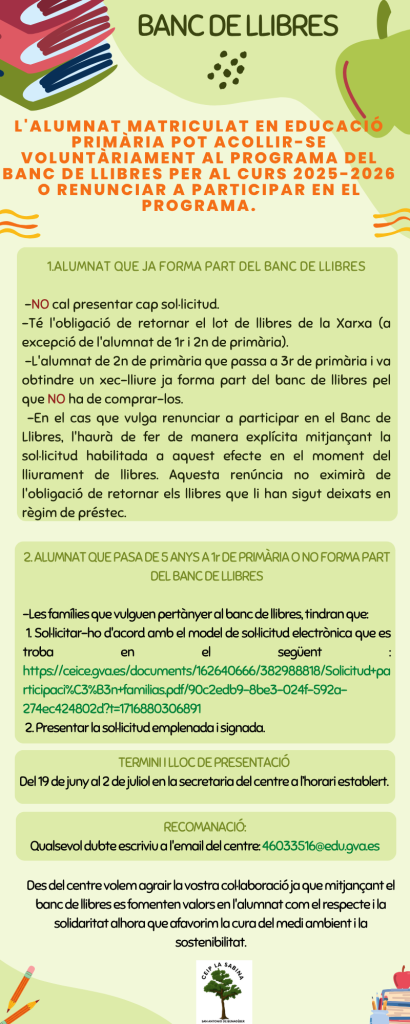 L’alumnat de primer i segon NO ha de comprar cap llibre. Es gestiona tot des del centre. Pel que no cal vindre a arreplegar el xec-lliure. Per a això, l’alumnat de 5 anys ha d’entregar la sol·licitud de participació en el banc de llibres.