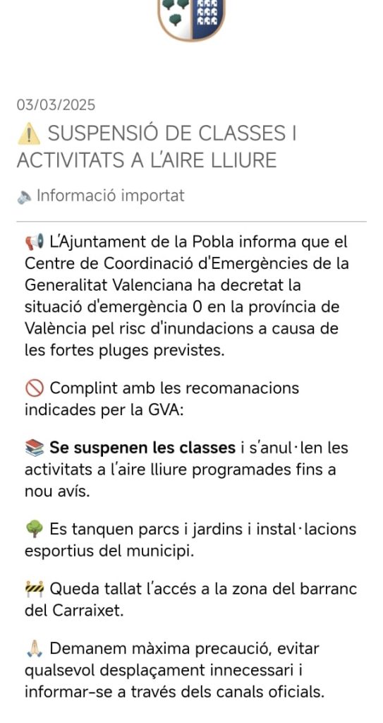 SUSPENSIÓ DE CLASSES FINS A NOU AVÍS