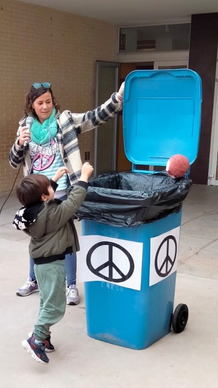 Nuestro alumnado de 5º y 6º leyó un manifiesto por la paz, todas las aulas tiraron a la basura un elemento que desean que desaparezca para que podamos vivir todos en paz y finalmente cantamos y bailamos todos juntos.