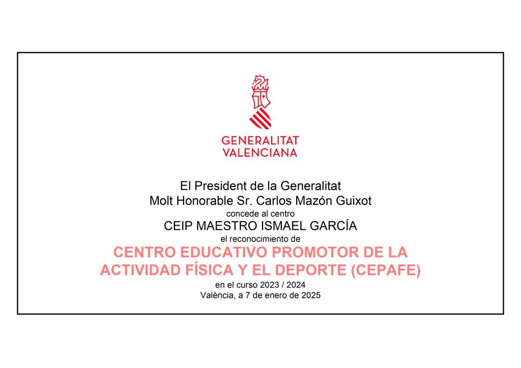 Nos enorgullece anunciar que el CEIP Maestro Ismael García ha sido reconocido como Centro Educativo Promotor de la Actividad Física y el Deporte (CEPAFE) durante el curso 2023-24. Este distintivo, otorgado por la Conselleria de Educación, Cultura y Deporte, certifica nuestro compromiso con la promoción de hábitos de vida saludables, la actividad física y el bienestar del alumnado.