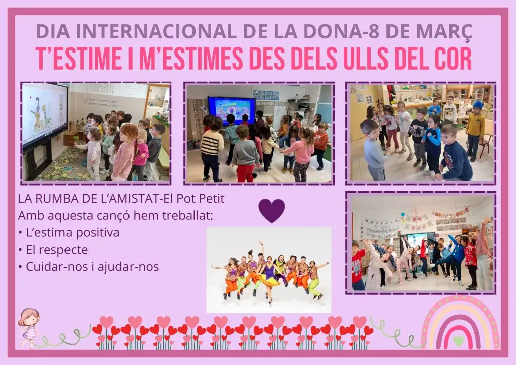 Amb motiu del 8 de març, Dia Internacional de la Dona, a l’etapa d’Educació Infantil hem realitzat diverses activitats per reflexionar amb els xiquets i xiquetes sobre el valor de l’estima, el respecte i la igualtat. A través de converses a l’aula, música, contes i activitats creatives, hem treballat la importància d’aprendre a voler-nos bé, escoltar-nos i cuidar-nos. Aquestes experiències ens han ajudat a entendre que totes les persones mereixen ser tractades amb respecte i que totes i tots podem somiar i arribar a ser allò que desitgem.