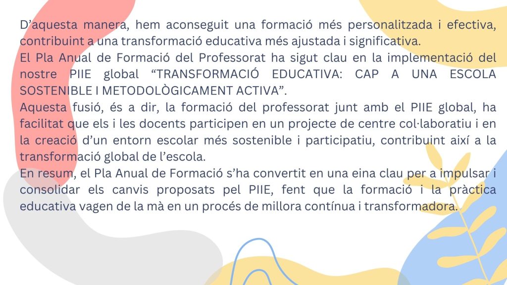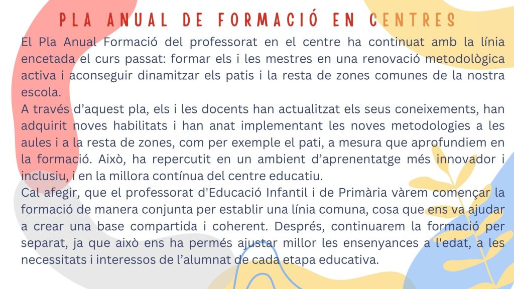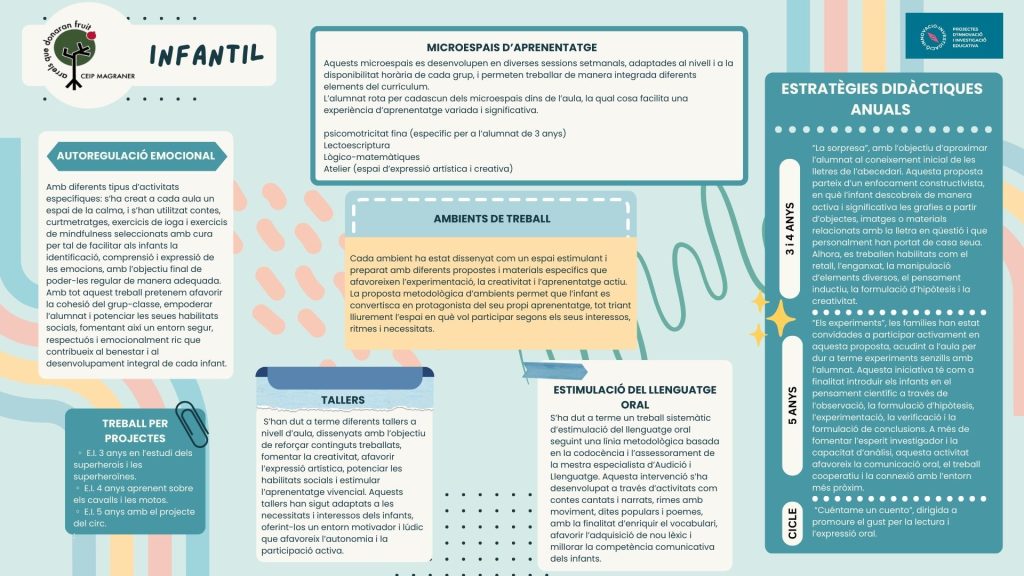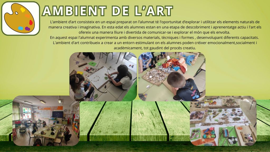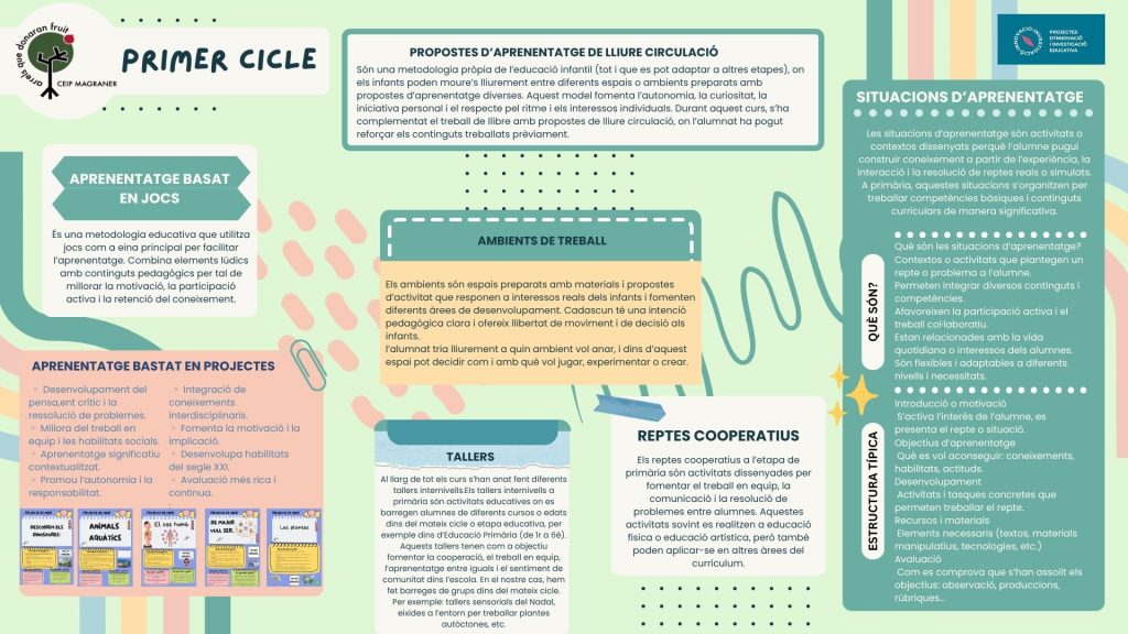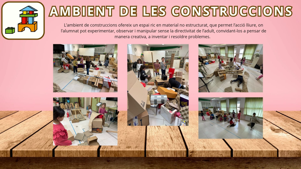 Durant aquest curs, el Primer Cicle d’Educació Primària ha engegat quatre ambients de treball i donada la limitació d’espais del nostre centre, ha estat necessari optimitzar els recursos disponibles mitjançant la creació d’espais polivalents. Aquesta decisió ens ha permès donar resposta a les necessitats pedagògiques dels ambients del primer cicle, aprofitant al màxim cada espai per a diferents usos educatius. Així, els ambients s’han dissenyat pensant-se per desenvolupar-se en aquests espais versàtils, adaptables segons l’activitat i les dinàmiques de cada moment.