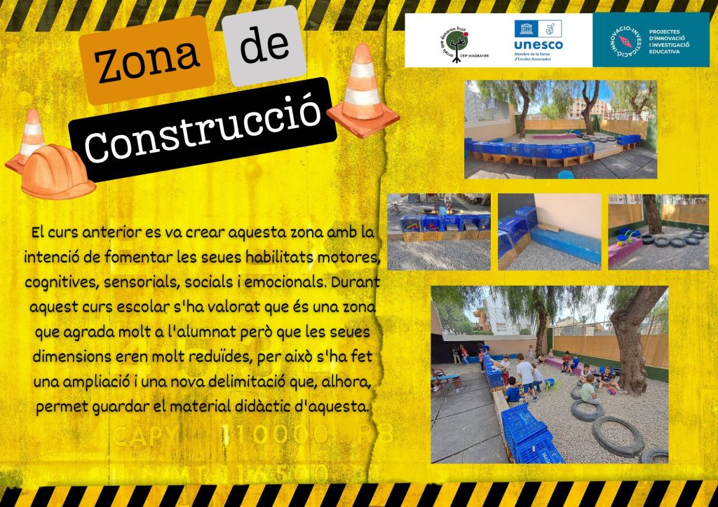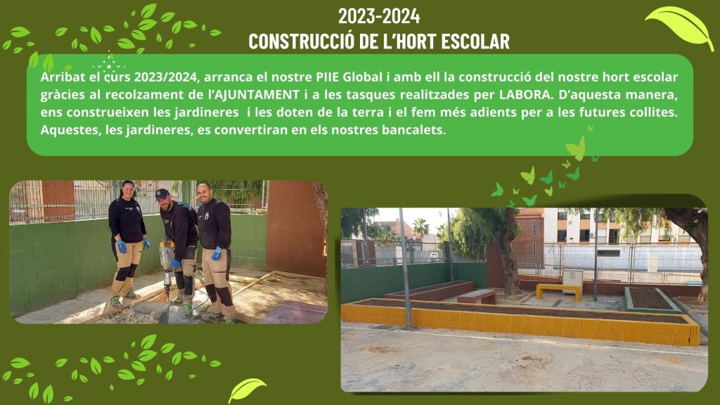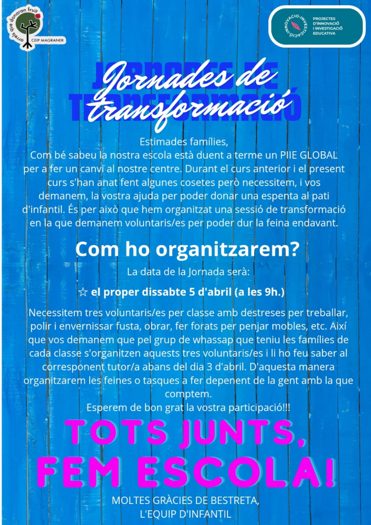 Després de la feina que feren els operaris de l’Ajuntament decidim continuar transformant l’espai de la zona infantil del nostre pati. És per això que es convoca una Jornada de Transformació on es demana la col·laboració de les famílies del cicle d’infantil per poder fer-ho possible. En aquesta jornada pretenem adequar la zona d’acampada (utilitzada també per a l’ambient de vida pràctica), reorganitzar i engrandir la zona de l’arener, fer més gran la zona de construcció i dotar-la de pedres noves, delimitar de manera més visible els diferents espais del pati, arreglar tots aquells elements que hagen sofert desperfectes, naturalitzar més l’espai en la mesura del possible,… entre d’altres feines.