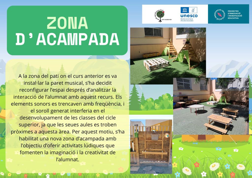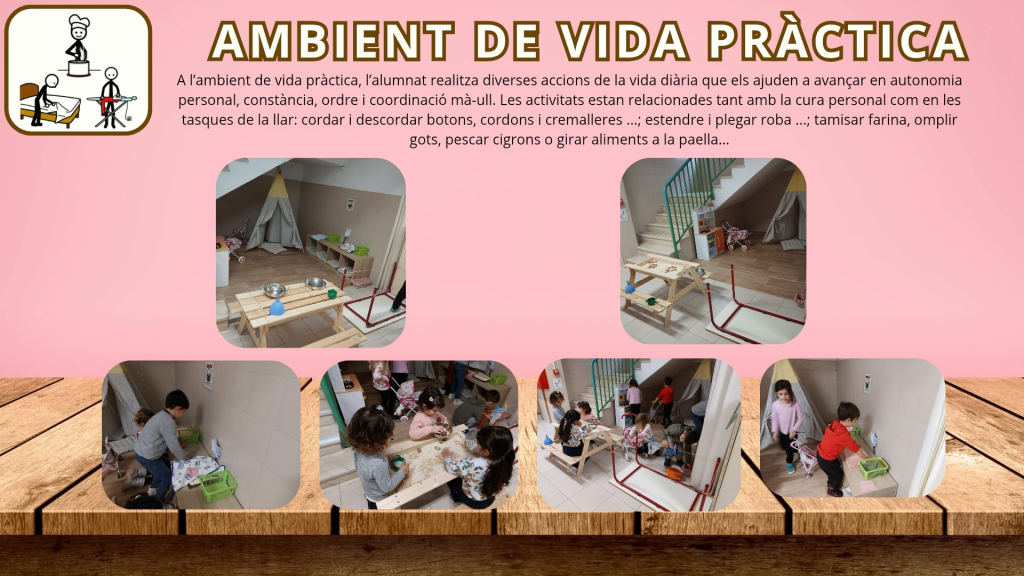 L’ambient de la vida pràctica es desenvoluparà habitualment al pati, a la zona d’acampada. No obstant això, en els dies de pluja, es traslladarà a l’espai “Calma’t i gaudeix” dins de l’edifici, adaptant així l’entorn per garantir el correcte desenvolupament de les activitats.