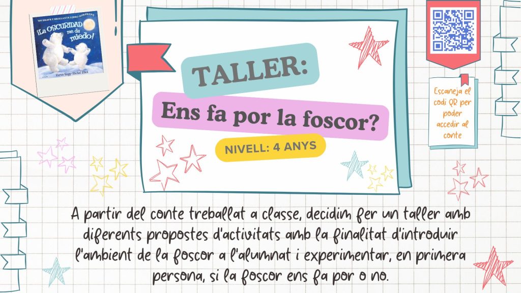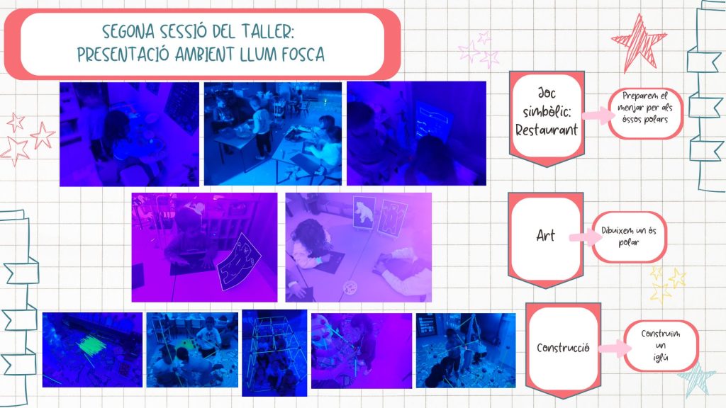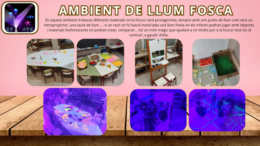 L’ambient de la llum fosca es durà a terme a l’aula de 4 anys A, on les llums per crear l’ambient estan disposades de manera fixa. Els dies en què es desenvolupen els ambients, els mestres adapten el mobiliari per garantir el correcte desenvolupament de l’activitat.