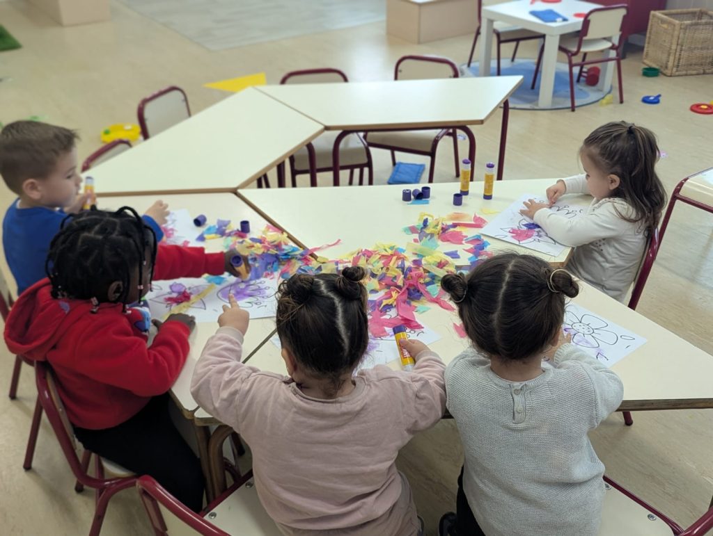 La clase de 2 años ha trabajado una actividad de motivación. Ademas, también han hablado de los colores que hay en primavera. Y luego los han pegado en unas flores y han hecho su guirnalda de primavera.