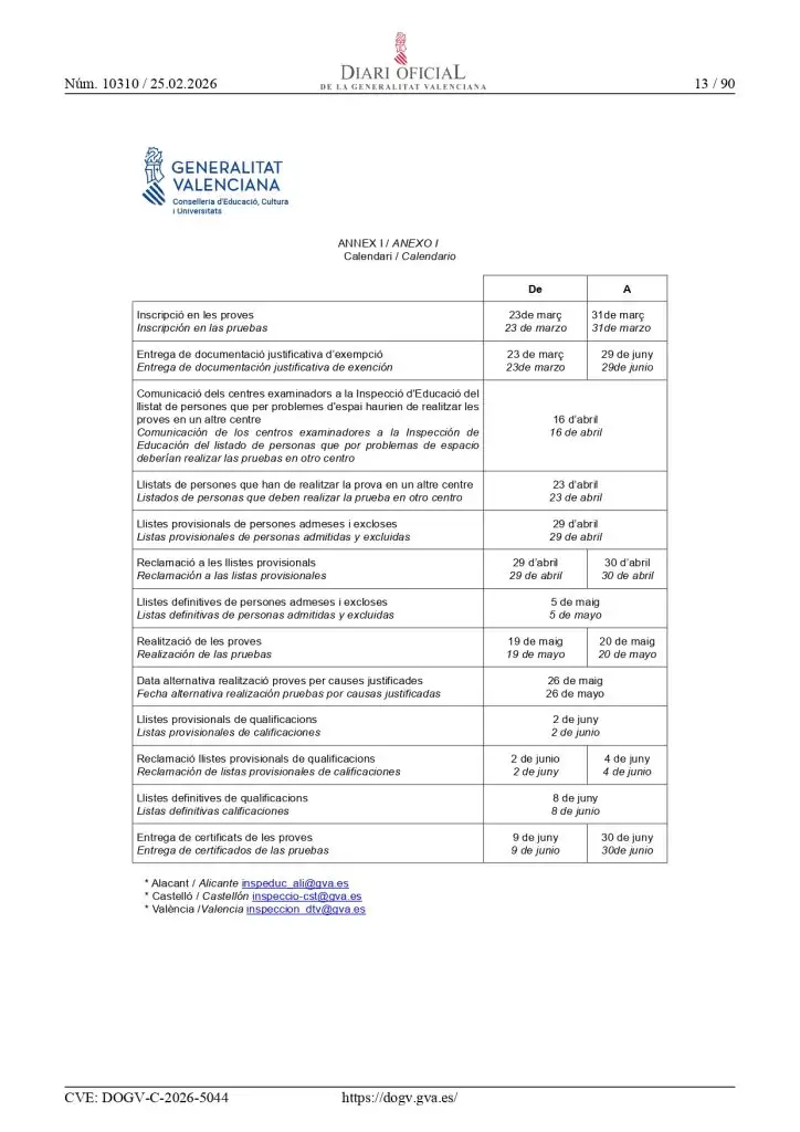 - La documentación justificativa de exención se presentará junto con el anexo VI (grado medio) o el anexo VII (grado superior) de la Resolución de 13 de febrero de 2026 (DOGV 2026/5044).