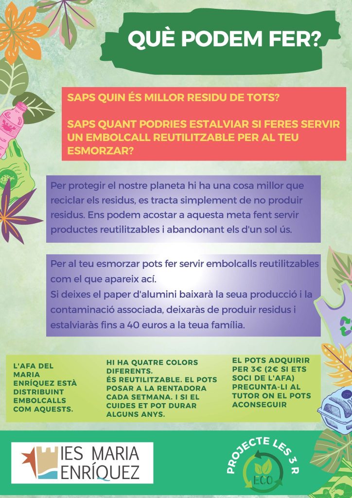 En el marc del projecte PIIE El nostre centre ODSitjable i del projecte Guardabosc i les assignatures d’Ànglès Oral i del Taller de mediambient, vos presentem els embolcalls que té a la venta l’AFA per tal de minimitzar els residus al nostre centre.