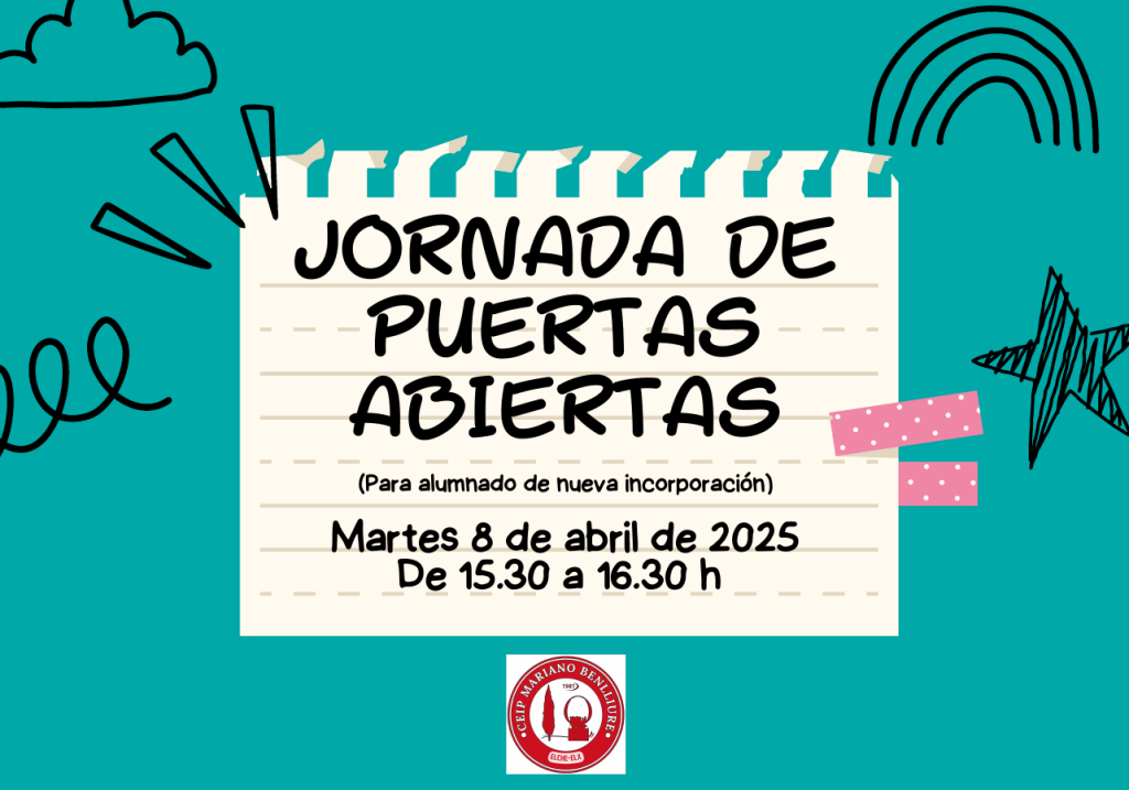 Con la finalidad de dar a conocer y aclarar dudas sobre nuestro centro a las familias que desean participar en el proceso de admisión para el curso 25-26, el martes día 8 de abril,de 15.30 a 16.30 h, se realizará una jornada de puertas abiertas.