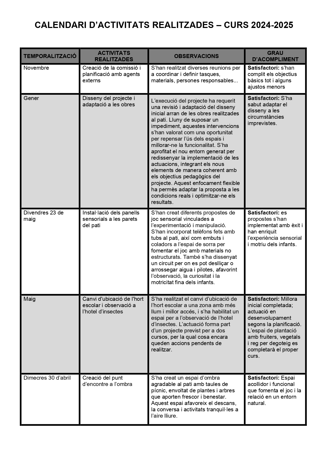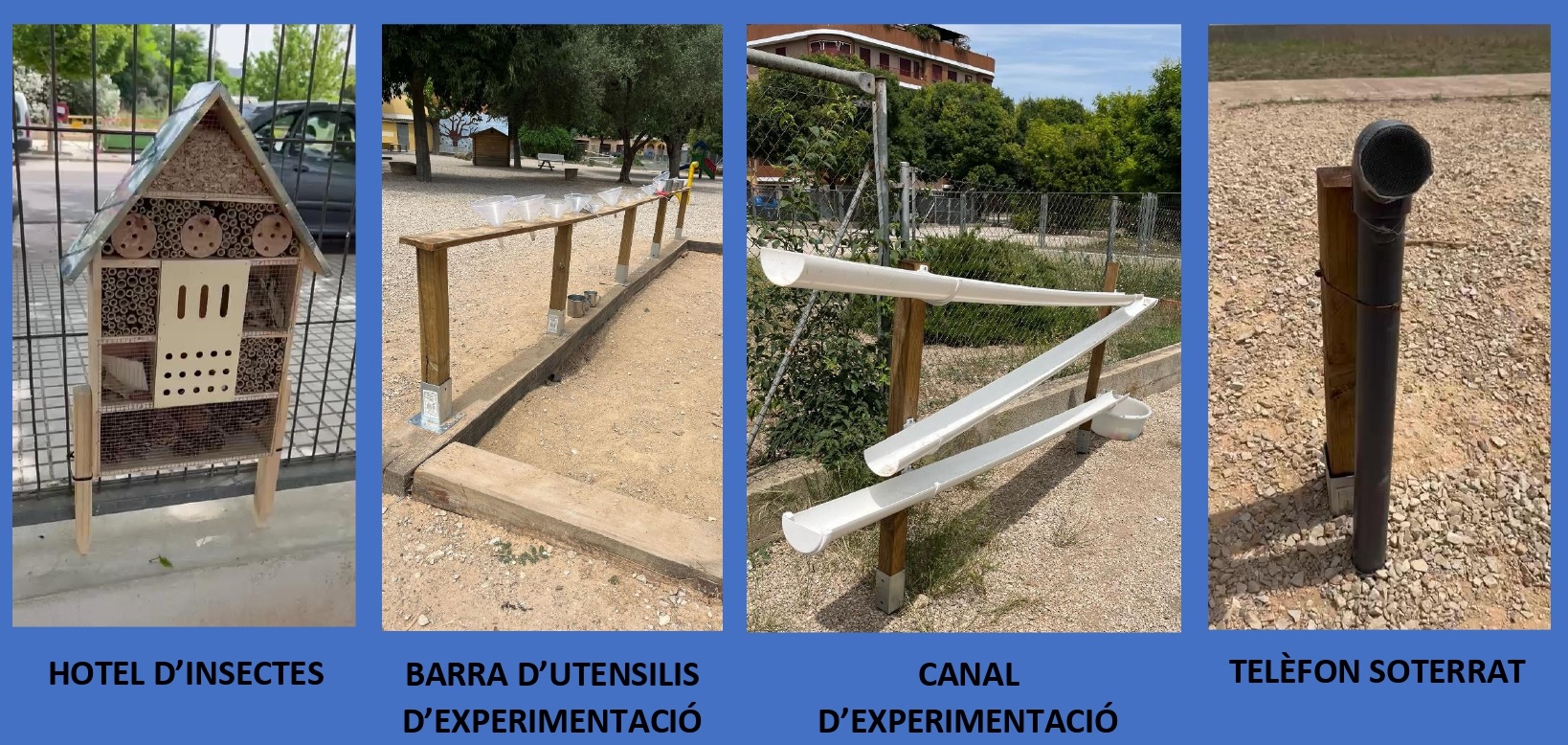 Amb la voluntat d’oferir als xiquets i xiquetes experiències riques, significatives i globalitzades, hem dissenyat i construït un camí sensorial amb una gran varietat de materials naturals: gespa, poda, fusta, sorra, pedres de diversos tamanys i fang. Esta proposta naix del desig d’estimular els sentits, afavorir el descobriment espontani i provocar el moviment a partir de la curiositat i la sorpresa.
