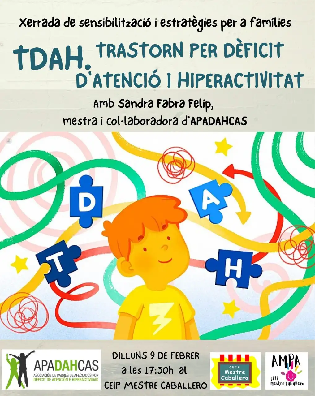 XERRADA SOBRE TDAH (Trastorn per dèficit d’atenció i hiperactivitat) per a famílies Dilluns 9 de febrer a les 17:30h al col·le. Amb Sandra Fabra Felip, mestra i col·laboradora d’ APADAHCAS, que ens parlarà del TDAH i ens donarà estratègies. T’esperem!