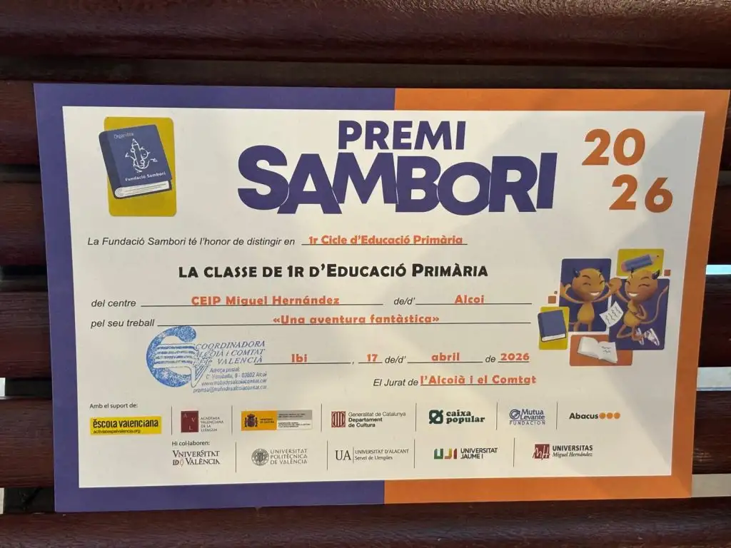 Continuem amb més alegries! El nostre alumnat de 1r de Primària, junt al seu mestre José Miguel, han tornat a guanyar el Premi Sambori. El passat 17 d’abril, van recollir a Ibi el guardó per la seua història “Una aventura fantàstica”🤩