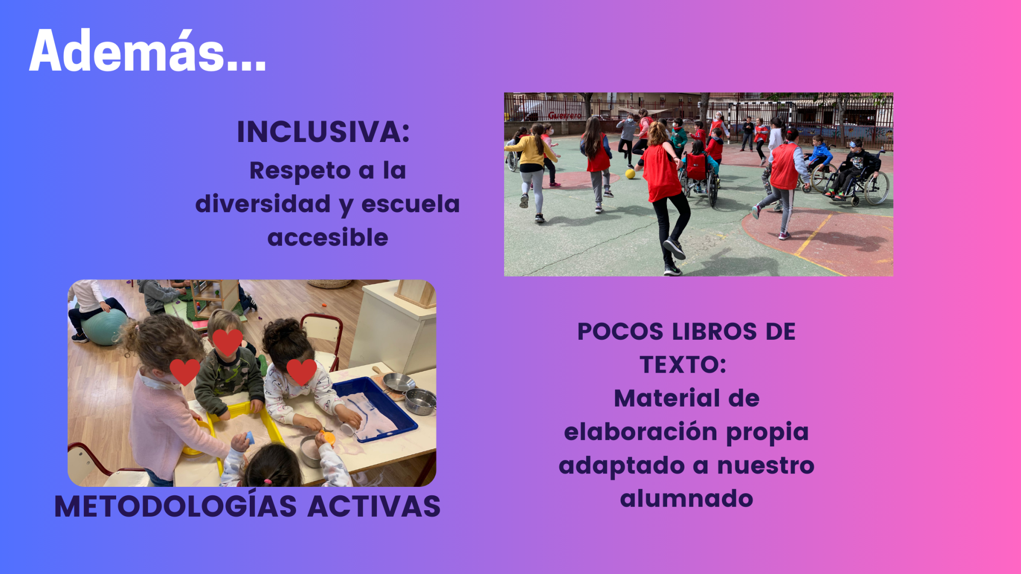 - INCLUSIÓN: Acogemos todo tipo de alumnado, sin discriminación por motivos de raza, etnia, diversidad funcional o religión.