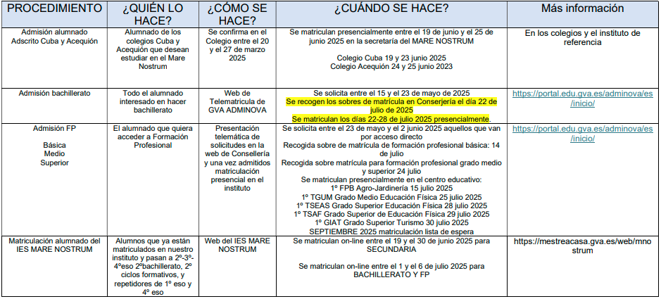 El alumnado que actualmente se encuentra en nuestro instituto en educación secundaria obligatoria en los cursos de 1º-2º-3º eso y en los cursos de 1º bachillerato, 1º de formación profesional no deberá realizar ningún trámite relacionado con la admisión.
