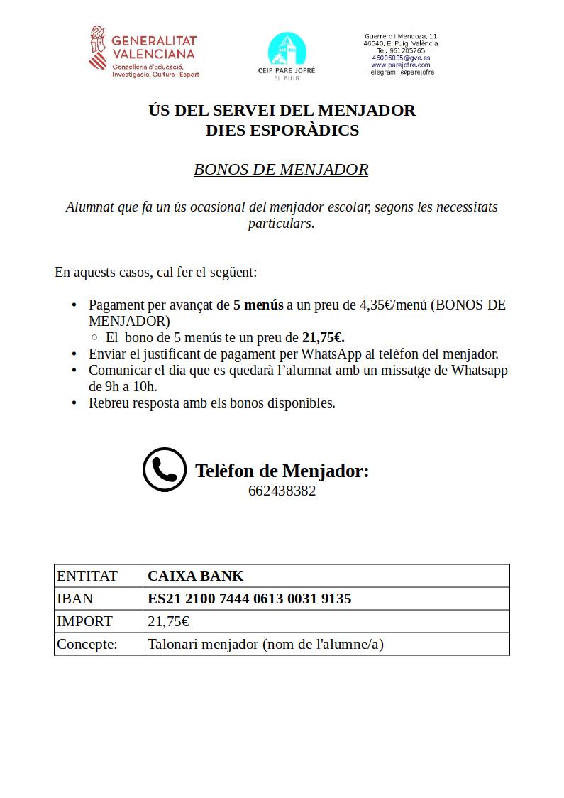 El preu del menú és de 4,35€ per dia (preu actualitzat des del curs 2024/2025).