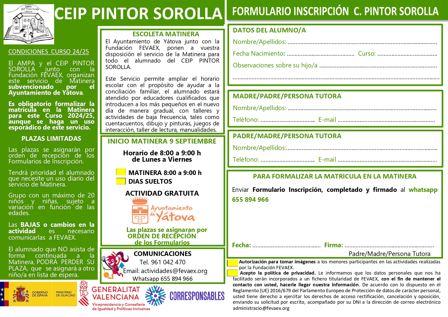 El servicio de matinera tendrá dos horarios para el acceso al mismo. Las 8:00 horas o las 8:30 horas.