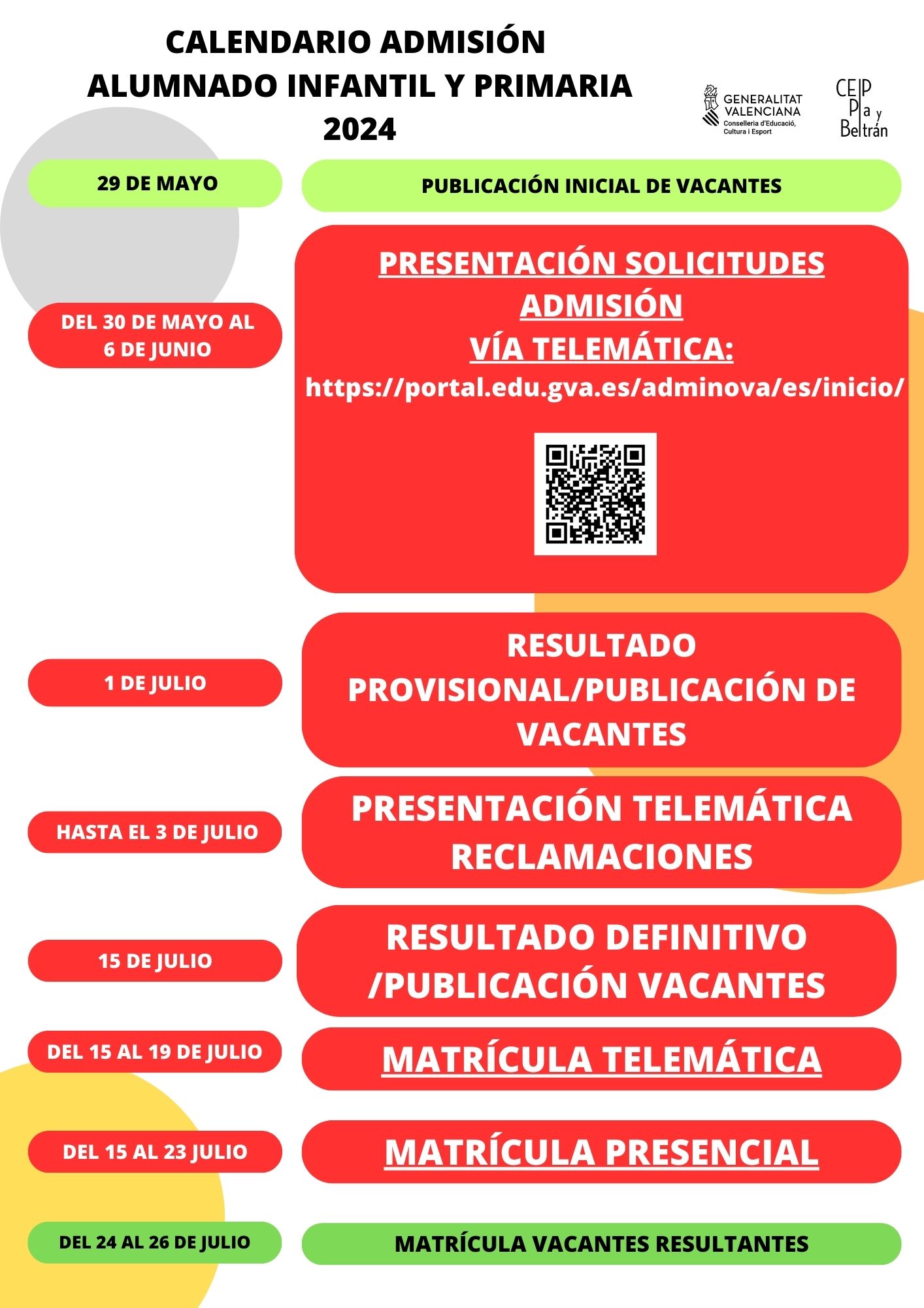 Hui ha eixit publicada en el DOGV la resolució del Director General de Centres Docents, por la que s’establix el calendari i es dicten instruccions respecte al procediment d’admissió de l’alumnat en els centres docents sostinguts con profunds públics de la Comunitat Valenciana que impartixen ensenyaments d’Educació Infantil, Educació Primària, Educació Secundaria Obligatòria i Batxillerat, i en els centres d’Educació Especial, per a ho curse 2024/2025.