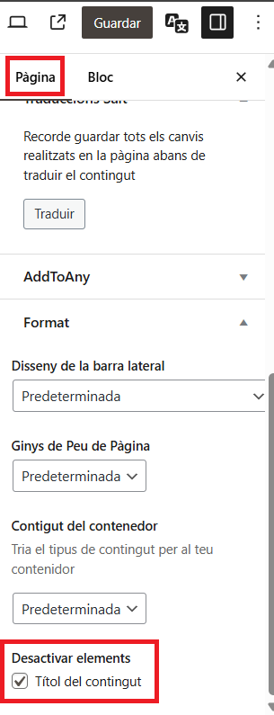 Para ocultar el título de cualquier página o entrada, solo tenemos que editarla y, una vez dentro del editor, en el panel derecho, en los ajustes de la entrada o página, en la parte de abajo, encontraremos la opción Desactivar elementos –> Título del contenido