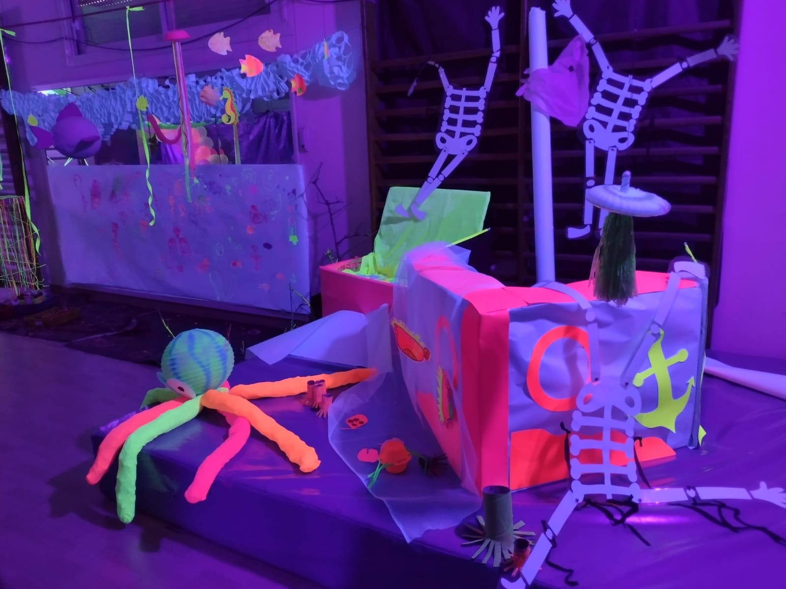 Les mestres de l’etapa d’infantil han estat preparant aquesta gran experiència sensorial durant mesos. Han dissenyat un túnel fosc com el fons marí on tots els sentits han pogut explorar i submergir-se amb els animals que l’habiten: llums, colors, sons i textures. A l’entrar tothom feia un silenci molt especial per a poder gaudir d’un audiovisual que aconseguia apropar-nos als crancs, a les meduses, les tortugues, els bancs de peixos, els cavallets de mar, estrelles de mar, la posidònia …,