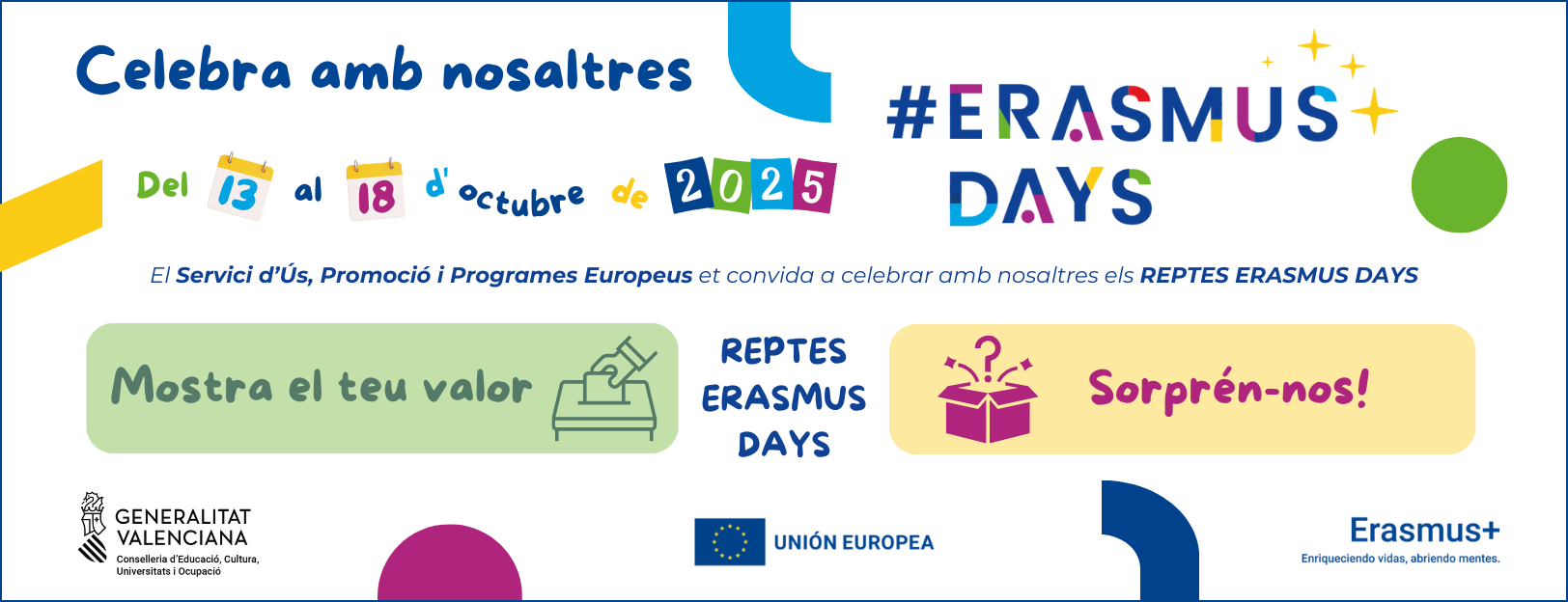 Al llarg de sis dies, del 13 al 18 d’octubre de 2025, #ErasmusDays busca mobilitzar a beneficiaris de projectes i xarxes professionals (estudiants, docents, formadors, famílies, personal no docent, alumnat…), perquè, a través d’activitats de comunicació i difusió, compartir experiències de mobilitat i cooperació a Europa i a tot el món, promoure les oportunitats finançades per la Unió Europea, divulgar els valors comuns europeus i maximitzar així l’impacte i repercussió dels projectes Erasmus+.